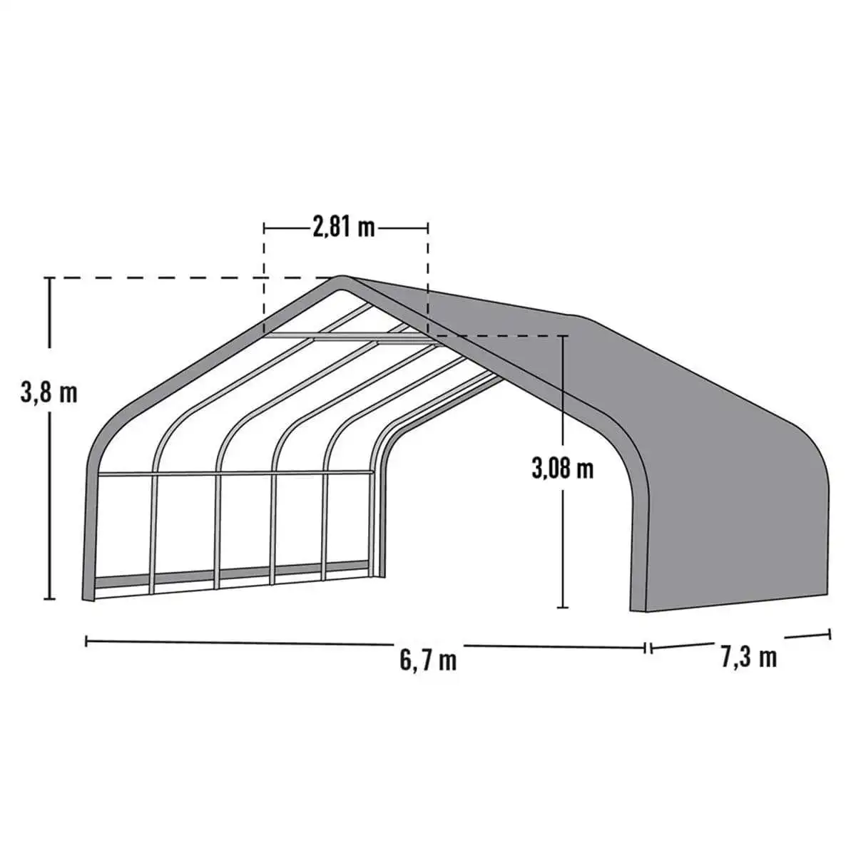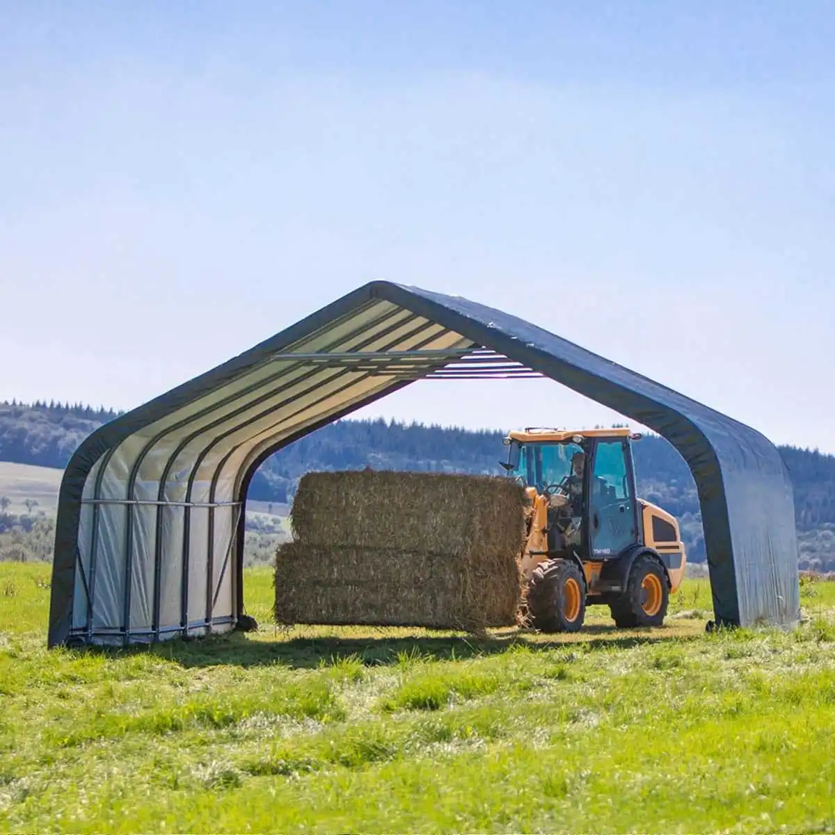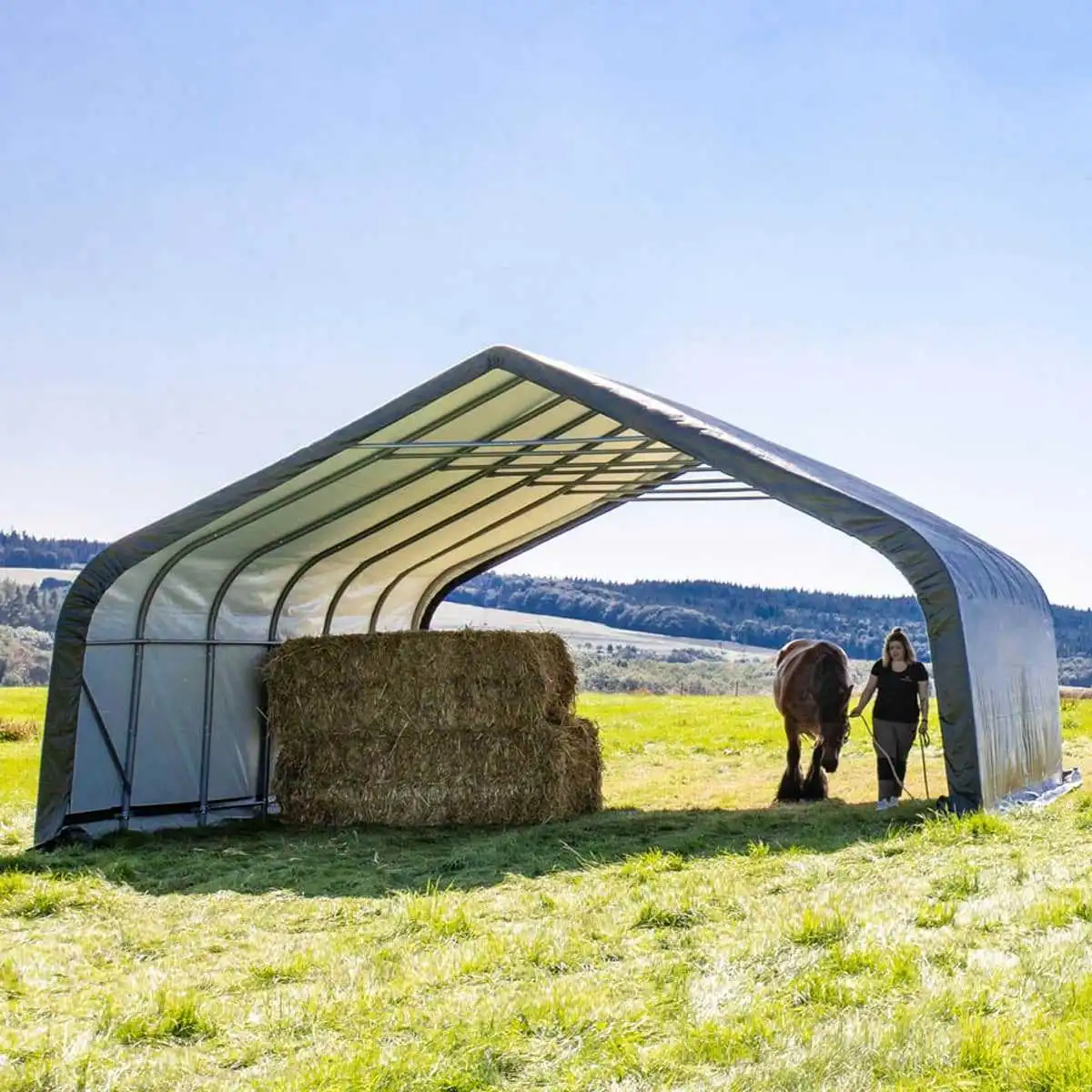 Cet abri en toile est polyvalent. Il peut être utilisé comme abri à chevaux, comme abri pour bétail (moutons et vaches par exemple) mais aussi comme abri de stockage pour le foin ou les machines agricoles.