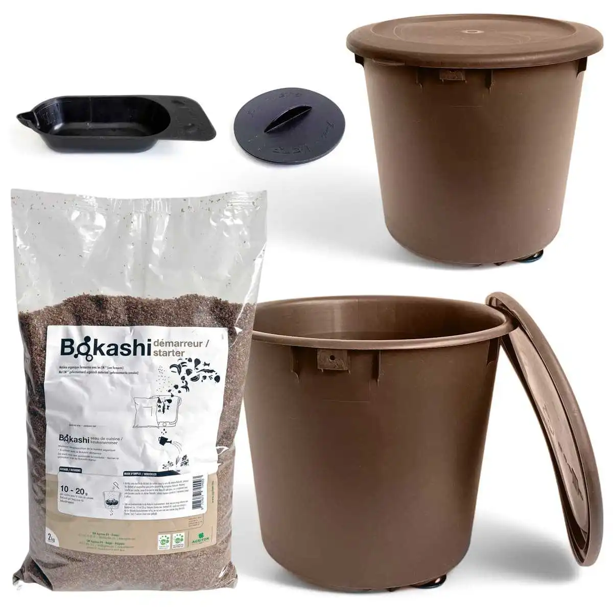 Bokashi Box Composteur de cuisine 10L - 1er prix - Lot de 2 seaux marron + 1 sac de son + pressoir + récupérateur de jus - D.29.5 x H.26 cm - Fabriqué en France