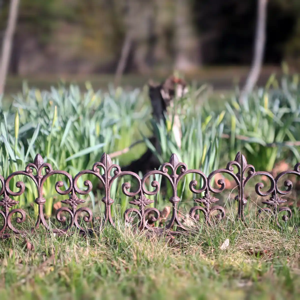 Les bordures en fonte se posent facilement grâce à leur deux grands pieds pointus, qui leurs permettent de tenir aisément en place devant vos massifs ou autour d'un arbre.