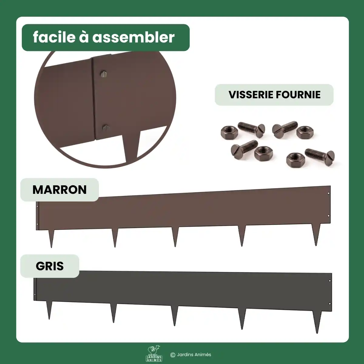 Bordurette métal acier français L.1m x H.15cm - Marron RAL 8017 Bordurette de bonne qualité, qui résiste bien dans le temps (on avait fait un premier achat il y a quelques années). On regrette juste que la visserie ne soit pas en inox, pour encore plus de durabilité.