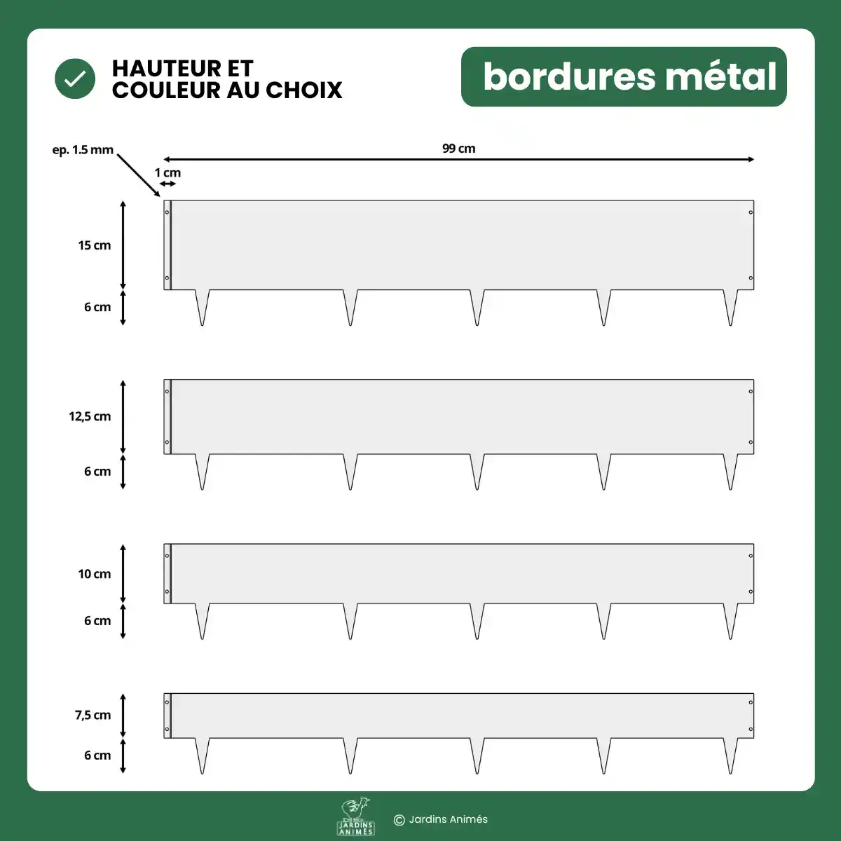 Bordurette métal acier 1m - français Excellente qualité. Très facile a installer et c’est durable dans le temps ! J’en recommande a chaque nouveau massif grâce aux différentes hauteurs proposées.