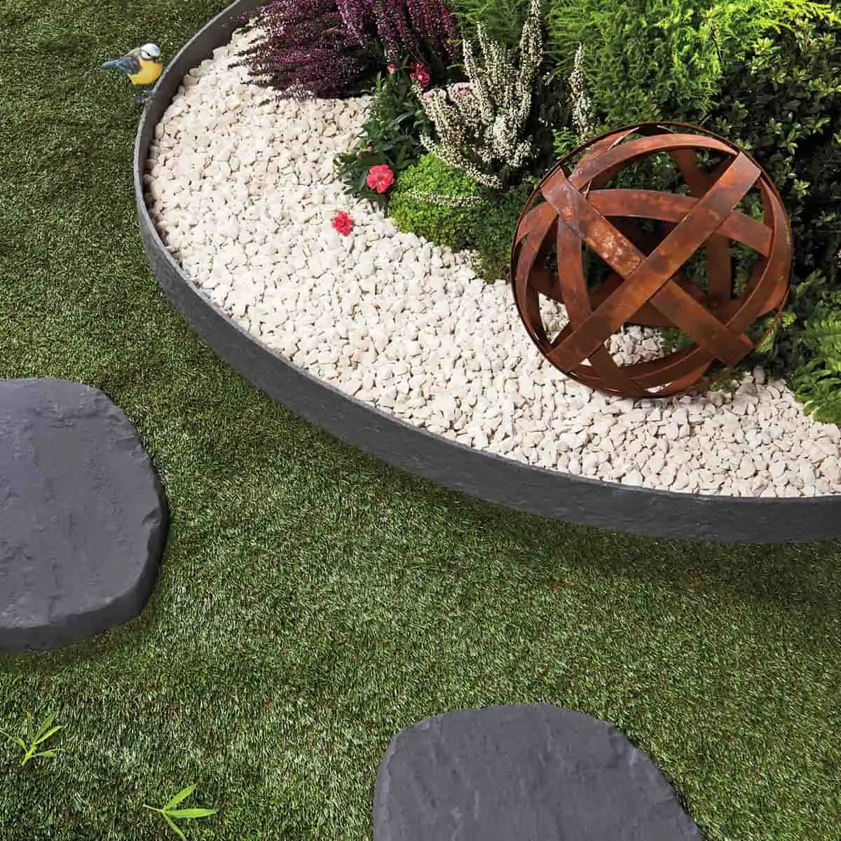 Très graphique, cette boule s'installe dans l'herbe, au milieu d'un massif ou d'un parterre de fleurs.