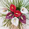 - Anthuriums : diamètre de 6 cm x 4 cm - 3 blanches, 2 rouges et 2 violettes