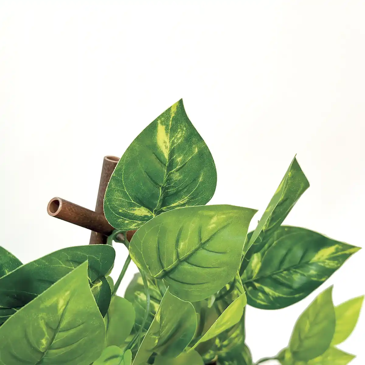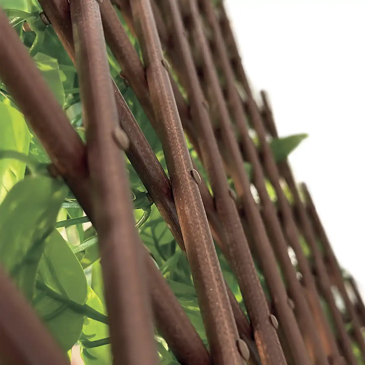 Un brise-vue original composé d'une armature en PVC marron imitant l'osier et d'un feuillage synthétique aux différentes tonalités de vert.