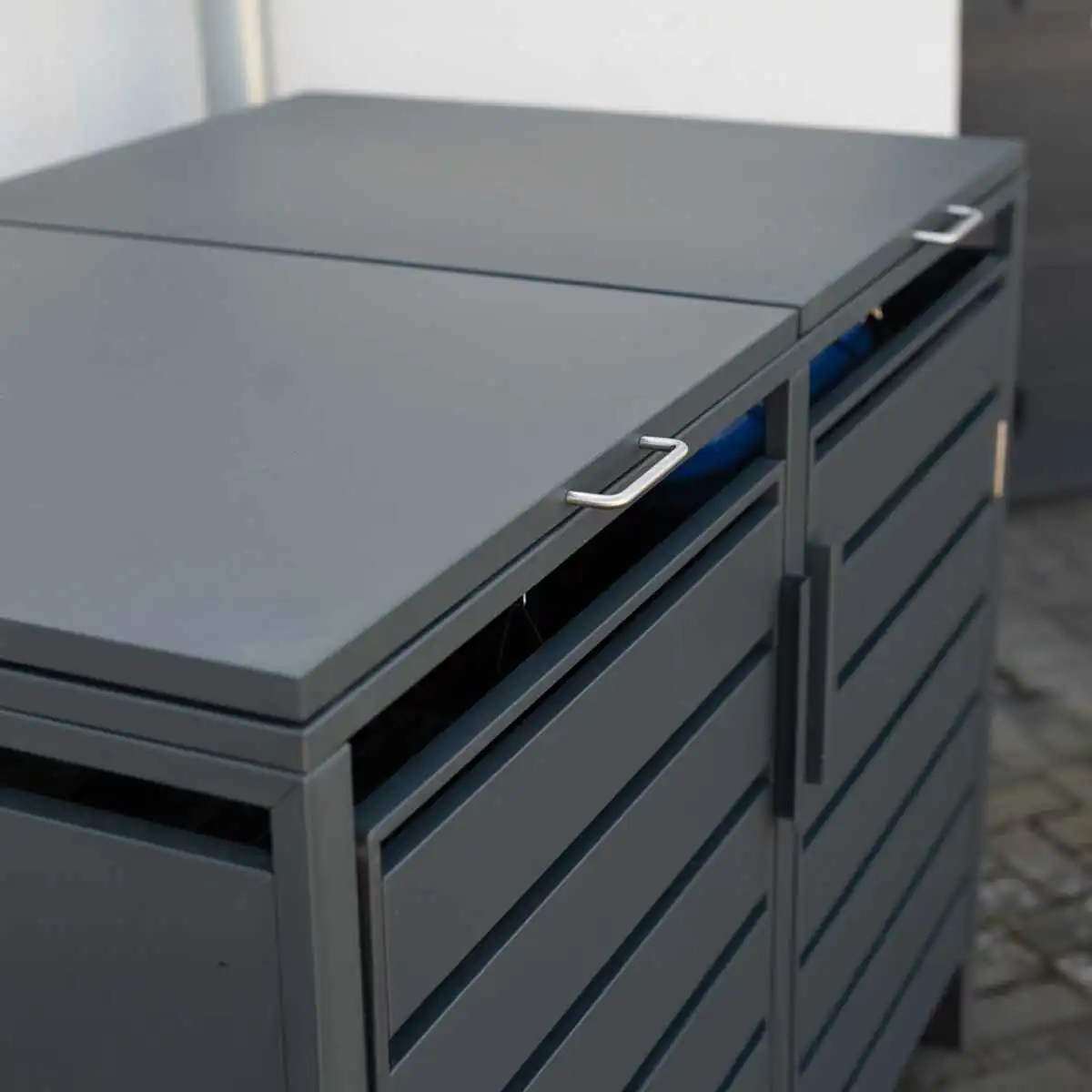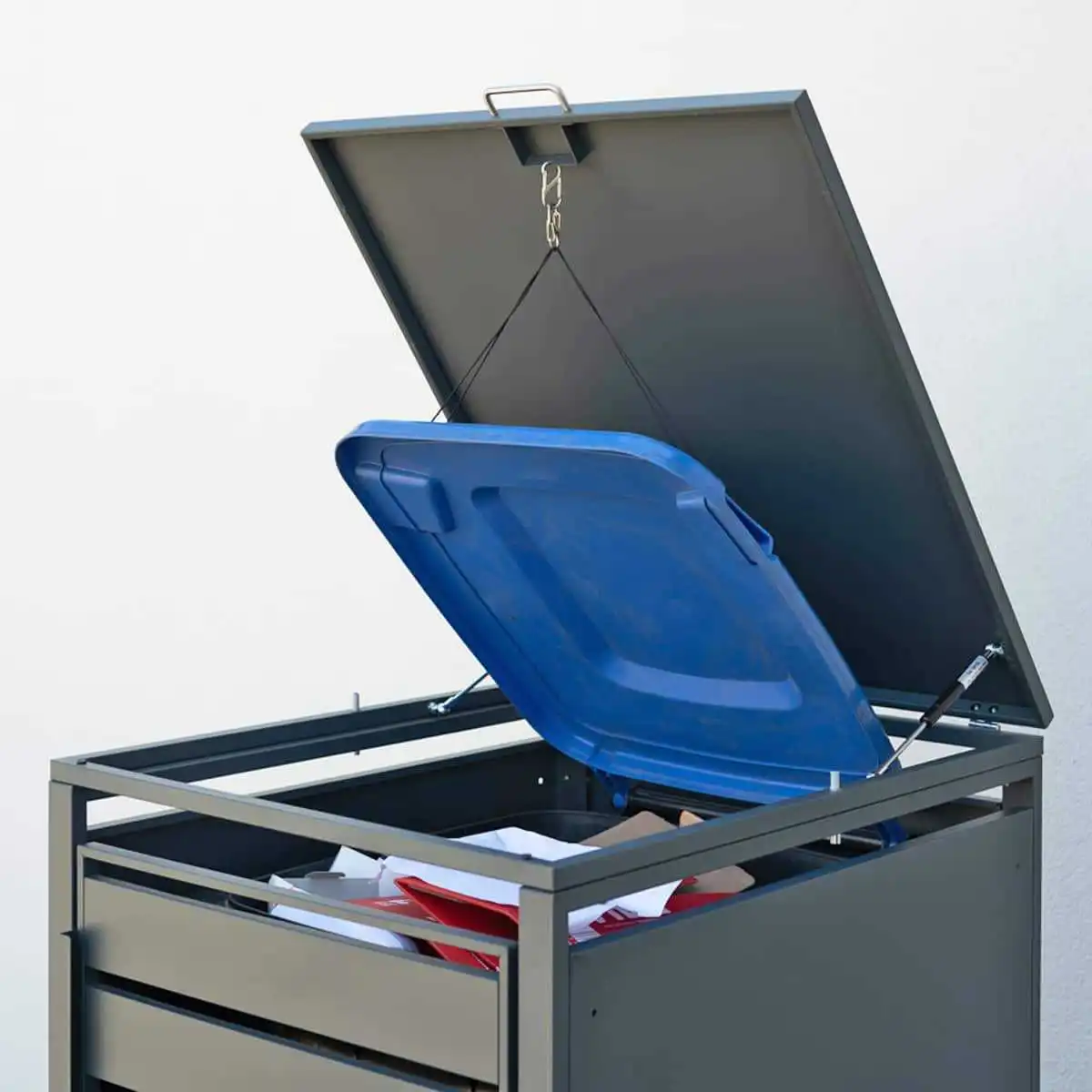 L'abri se ferme à l'aide des portes montées sur charnières, pour une dissimulation parfaite de son contenu. Les vérins à gaz installés sur le couvercle empêchent la fermeture incontrôlée du couvercle et permettent de déposer les déchets sans se salir les mains.