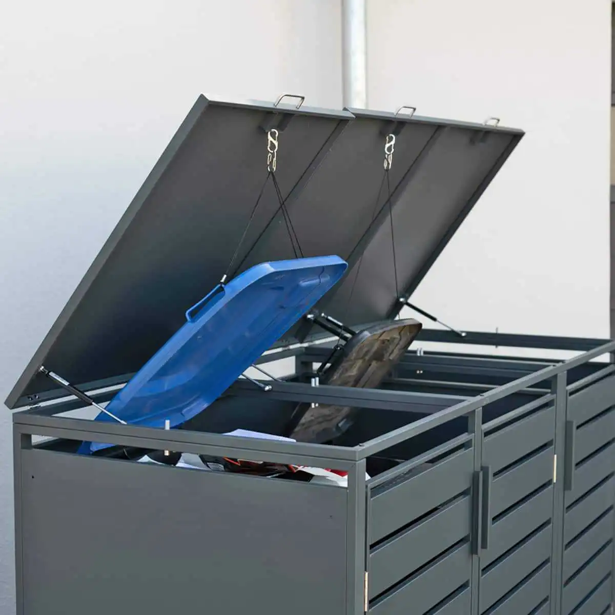 L'abri se ferme à l'aide des portes montées sur charnières, pour une dissimulation parfaite de son contenu. Les vérins à gaz installés sur le couvercle empêchent la fermeture incontrôlée du couvercle et permettent de déposer les déchets sans se salir les mains.