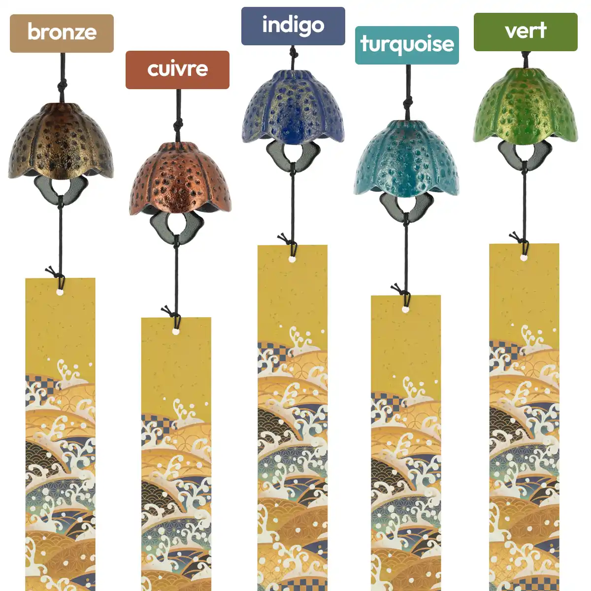 Également appelée fûrin (« Fu » est le vent et « Rin » la cloche en japonais), ce carillon traditionnel en fonte sonne au gré du vent. Un léger courant d'air et le tintement subtil vous parvient jusqu'aux oreilles.
