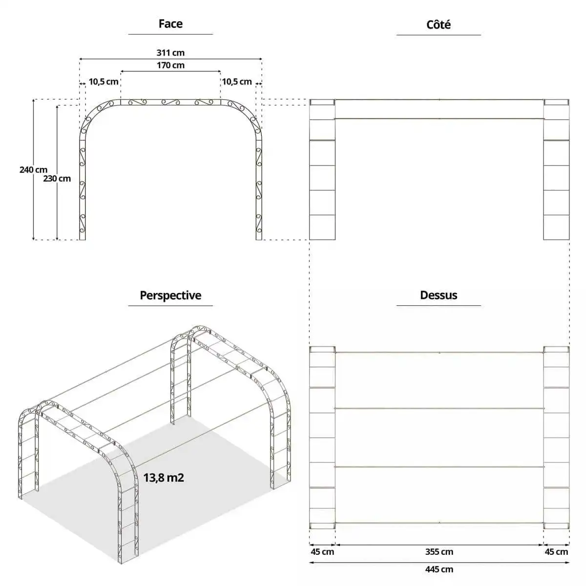Carport Arcade 13,80m2 Bel effet visuel. Je l'ai utilisé pour abriter mon potager des chaleur. Le métal est très léger mais suffisamment robuste pour y faire monter des plantes grimpantes. Pour le montage et le placement, être à 2 c'est bien, à 4 c'est mieux. Les vis ne semblent pas être de bonne qualité.
