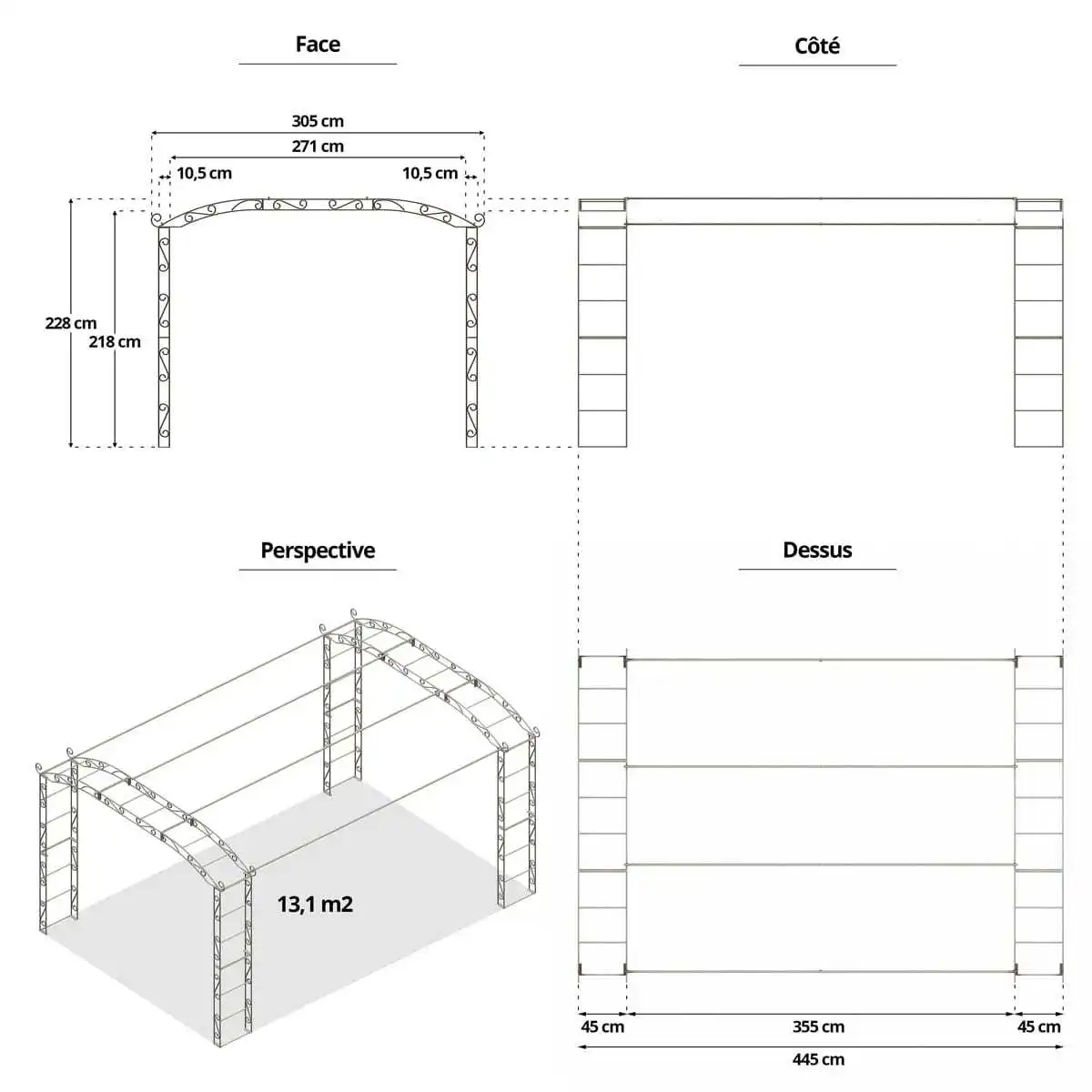 - Dimensions hors tout : larg. 3,05m x long. 4,45m x haut. 2,28m