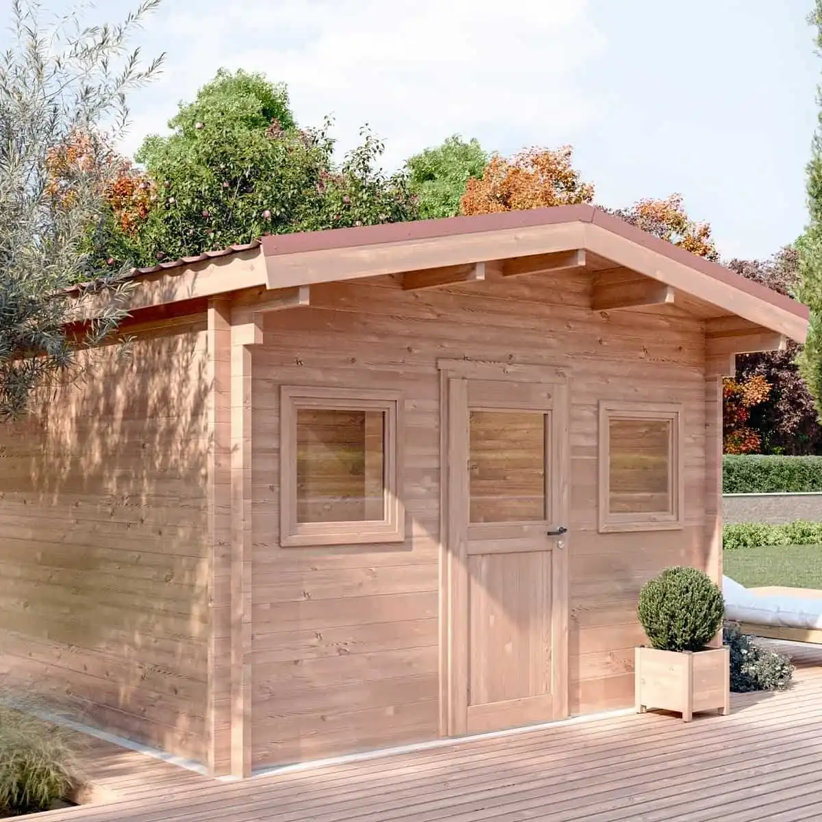 Son toit pentu est réalisé en acier (bacacier imitation tuiles rouges ou anthracites) pour une plus grande résistance aux intempéries et une meilleure durabilité. La structure en madriers massifs de 55mm est plus isolante que les simples panneaux de bois d'un abri de jardin 1er prix.