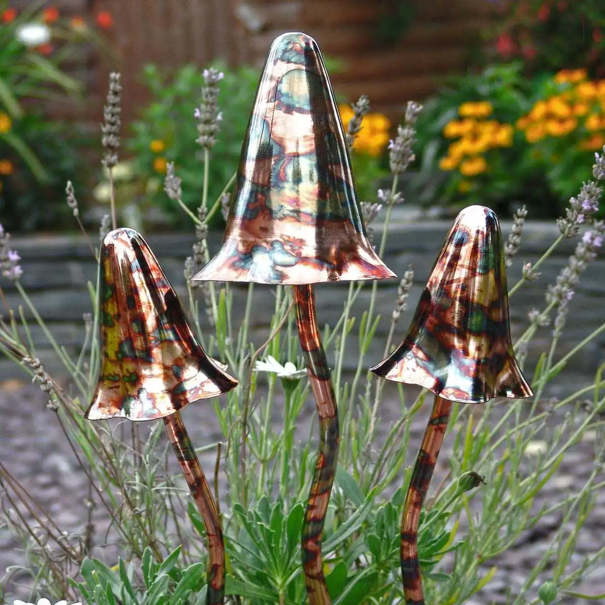 En métal cuivré, ces champignons pointus donnent vie à un sous-bois. Ils font ressortir vos plantes et fleurs du jardin grâce à leur couleur majestueuse entre le rougeâtre et le rouge orangée.