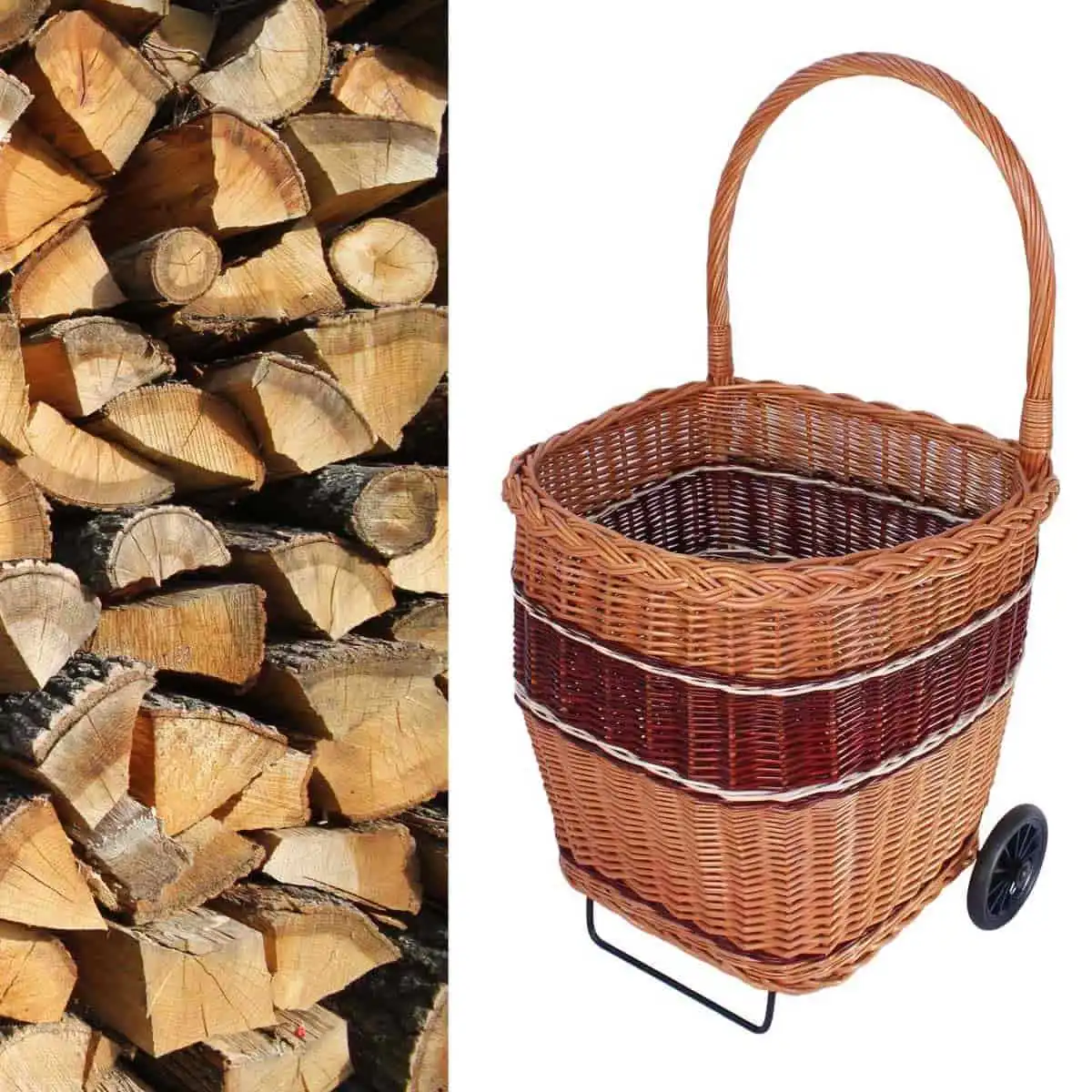 Aussi pratique qu'élégant, ce chariot en osier tressé facilitera le transport de vos bûches de bois cet hiver.
