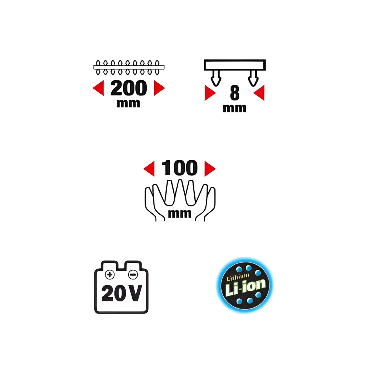 - Longueur de coupe de la lame de cisaillement d'arbustes : 200 mm