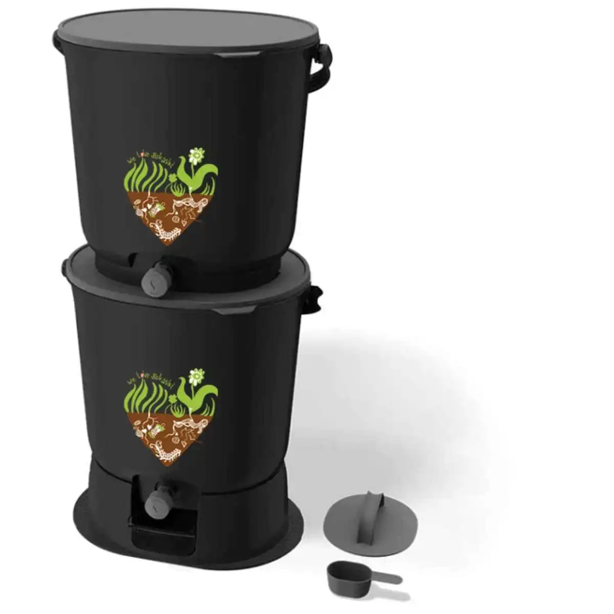 Composteur Bokashi ESSENTIAL 2 seaux noir + sac de son 2kg Excellent produit qui permet de réduire considérablement ses déchets ! Deux sceaux, c'est très pratique pour faire une rotation : pendant qu'un est plein et fermente, je remplis l'autre :) .