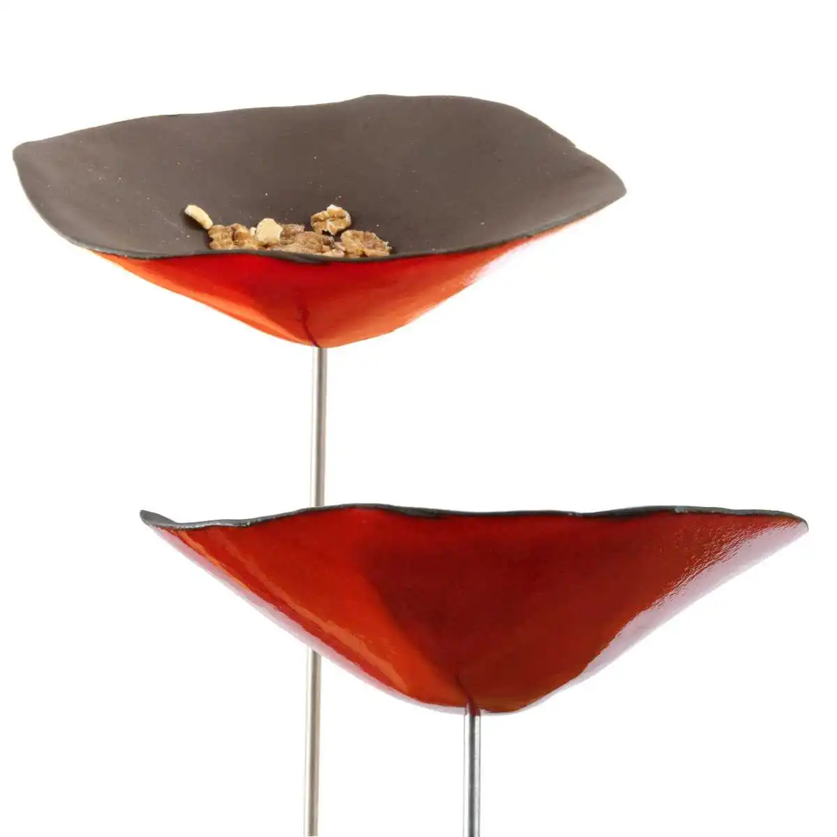 Garnissez de graines à oiseaux ou d'un peu d'eau ce magnifique coquelicot émaillé pour vous régaler du spectacle des ballets des oiseaux.
