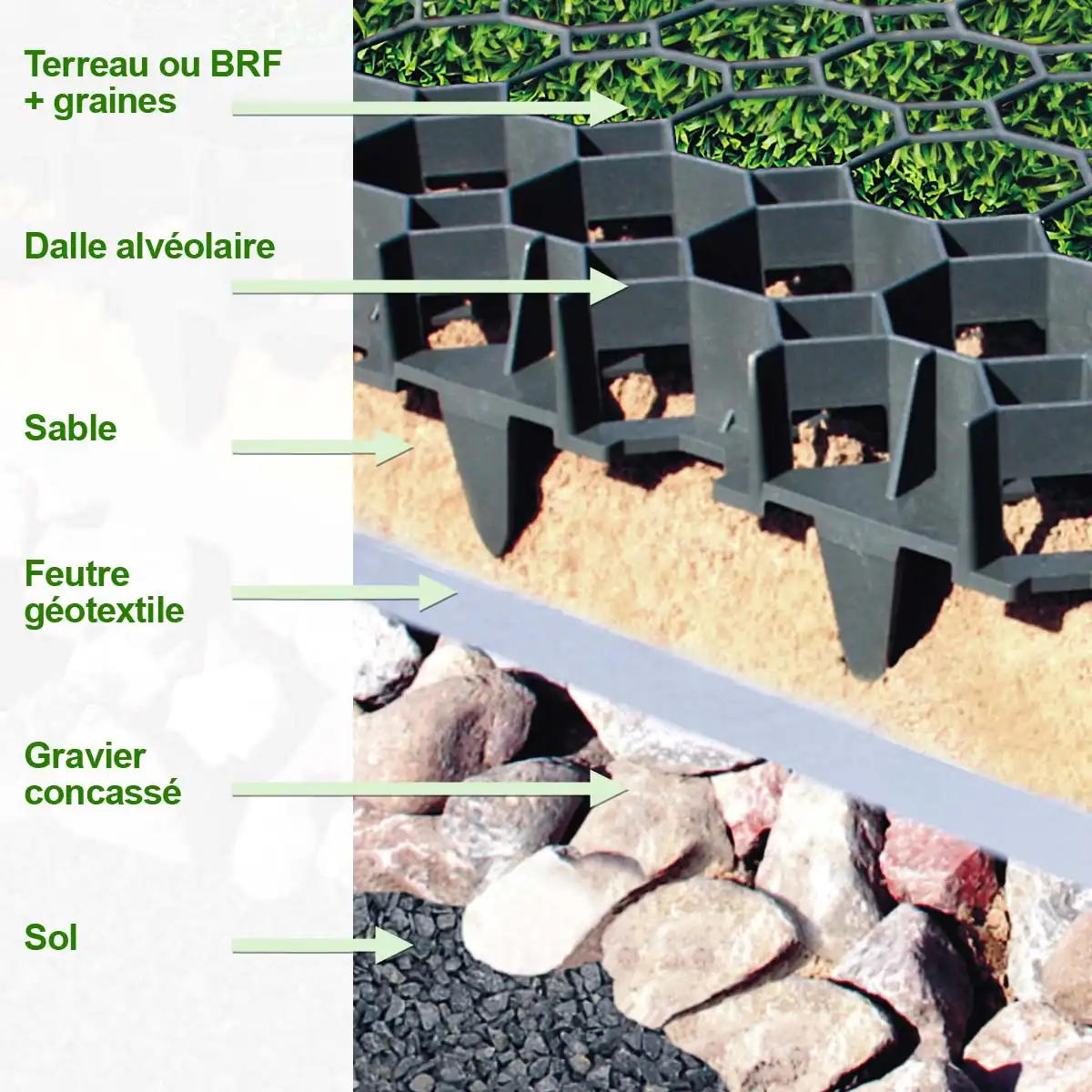 Parfait pour la stabilisation et le durcissement du sol, cette solution économique et très résistante assure un drainage naturel de l'eau dans le sol et vous permet de faire pousser de l'herbe dessus.