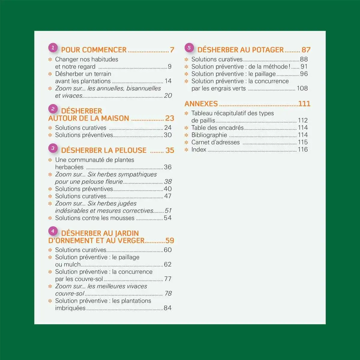 Pour les allées, la pelouse, les massifs, le verger ou le potager, il existe des solutions écologiques, toutes détaillées dans cet ouvrage illustré de nombreuses photos. Denis Pépin décrit les différentes méthodes tant préventives (choix des aménagements, paillage, engrais verts, etc.) que curatives (désherbage manuel, mécanique, thermique, etc.). Pour chacune, il présente les outils utilisés, les surfaces concernées et les résultats obtenus.
