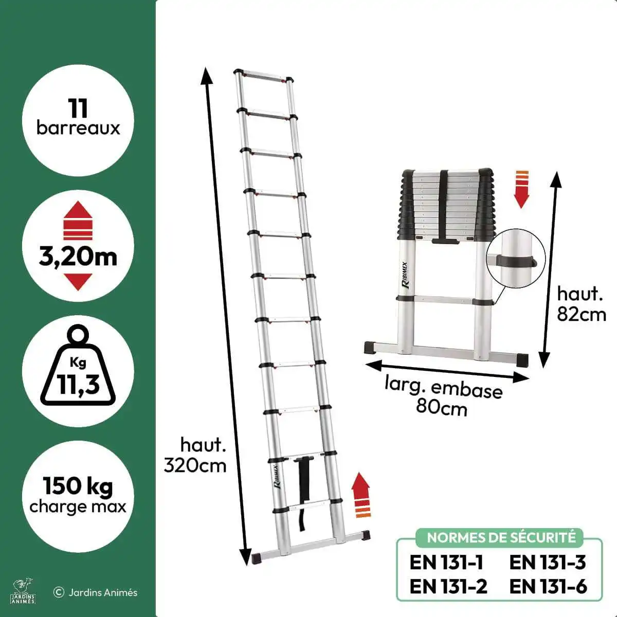 - Hauteurs : de 2,61 m à 3,90 m en extension totale