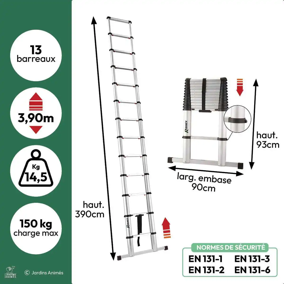 Échelle télescopique en aluminium - 13 barreaux - H.93 à 390 cm