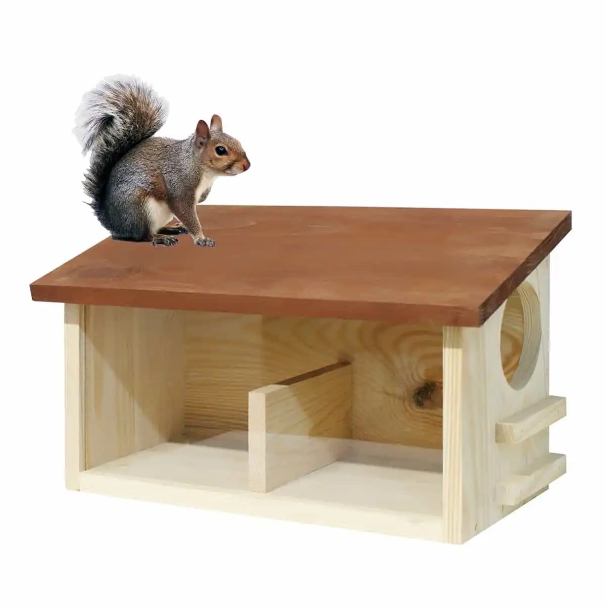 Voici un buffet garde-manger pour écureuils, fabriqué en pin certifié FSC (bois provenant de forêts gérées durablement).
