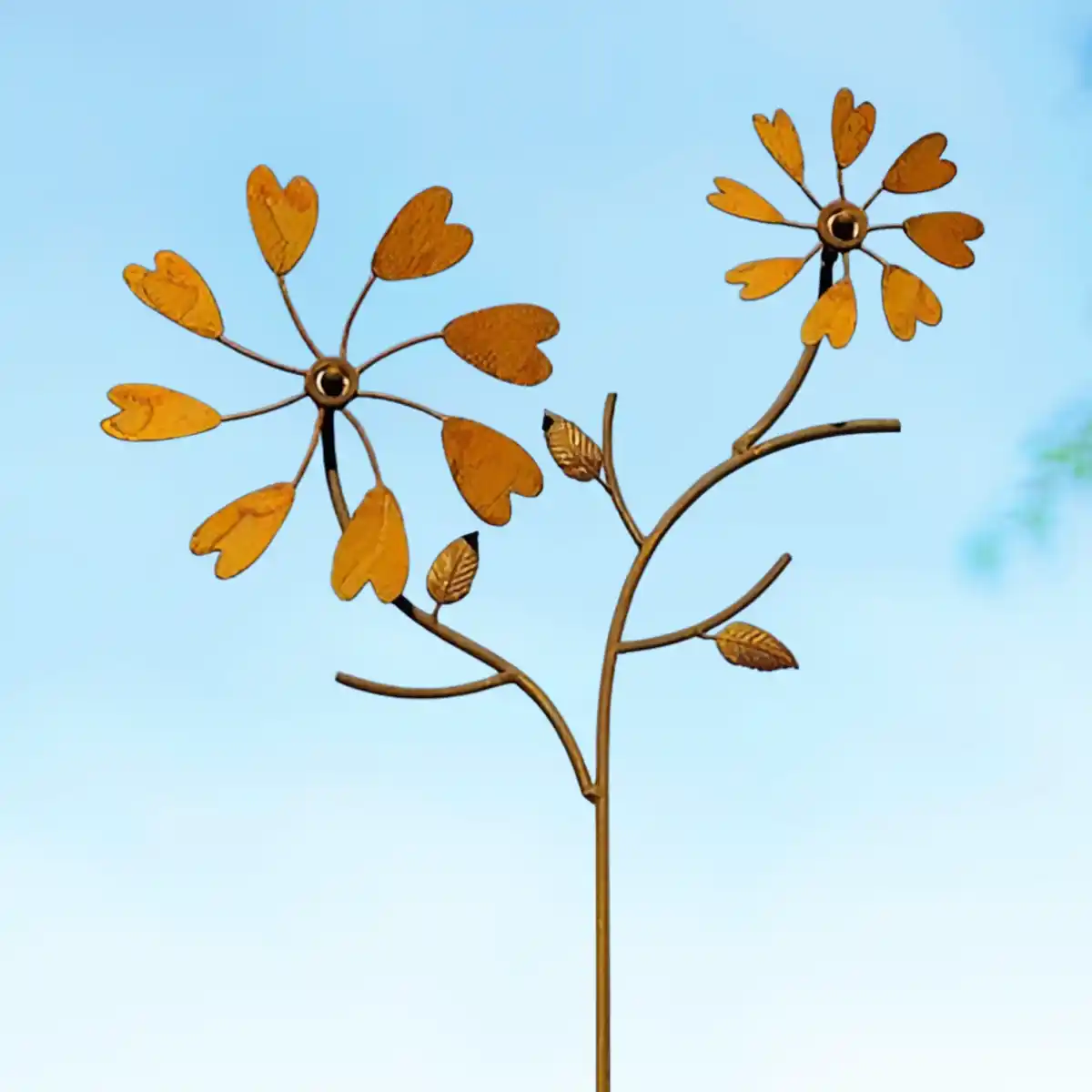 Ce moulin à vent est monté sur une tige fine. Il est composé de deux spirales, chacune dotée de pales en forme de coeurs, créant ainsi un mouvement fluide et hypnotique dès que souffle la brise..