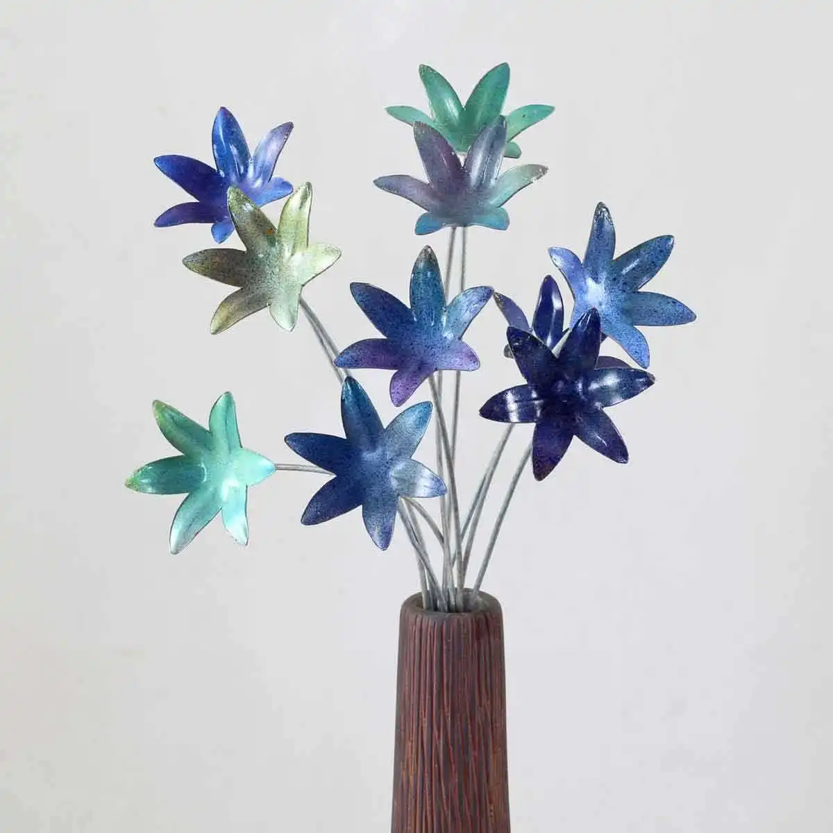 Petites fleurs artisanales en acier - Nuances de bleu - lot de 10 Jolies fleurs. Plus petites qu'elles ne semblent sur la photos. J'en recommandé un lot pour étoffer le bouquet