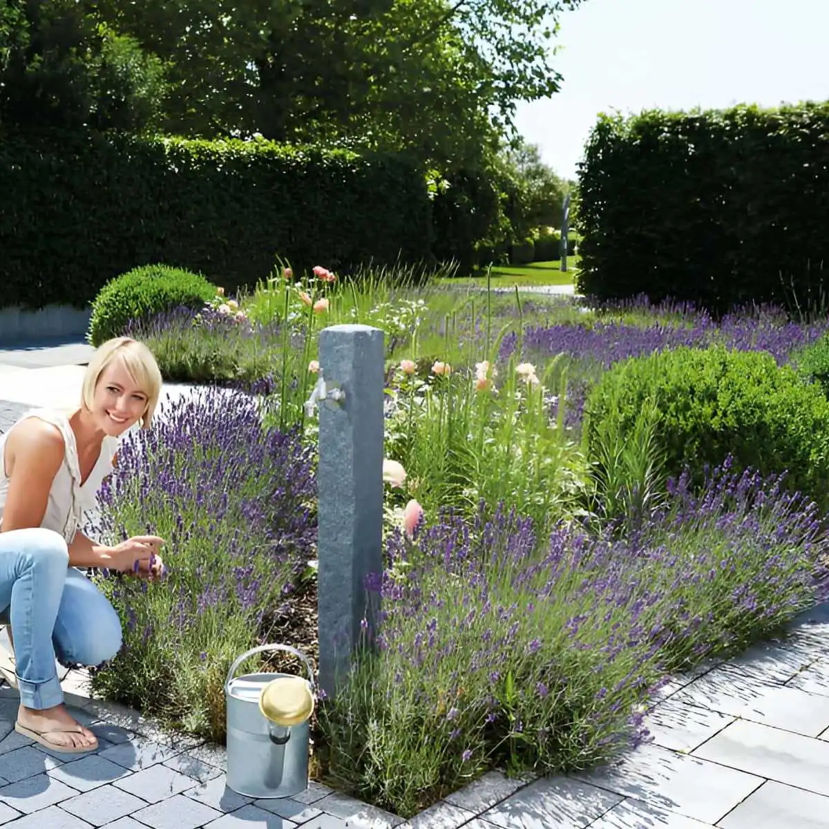 Cette borne de distribution d'eau pour le jardin en forme de colonne permet d'avoir un point d'eau discret et élégant à n'importe quel endroit du jardin.