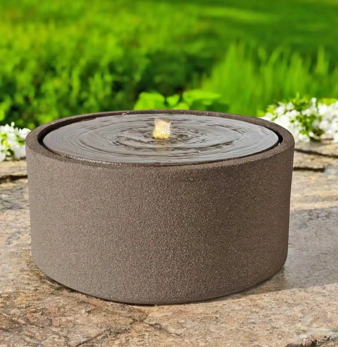 Plus qu'une fontaine, elle constitue un véritable objet de déco pour le jardin. Sa forme ronde fait penser à un petit bassin... idéal pour créer un jardin zen sans entretien.