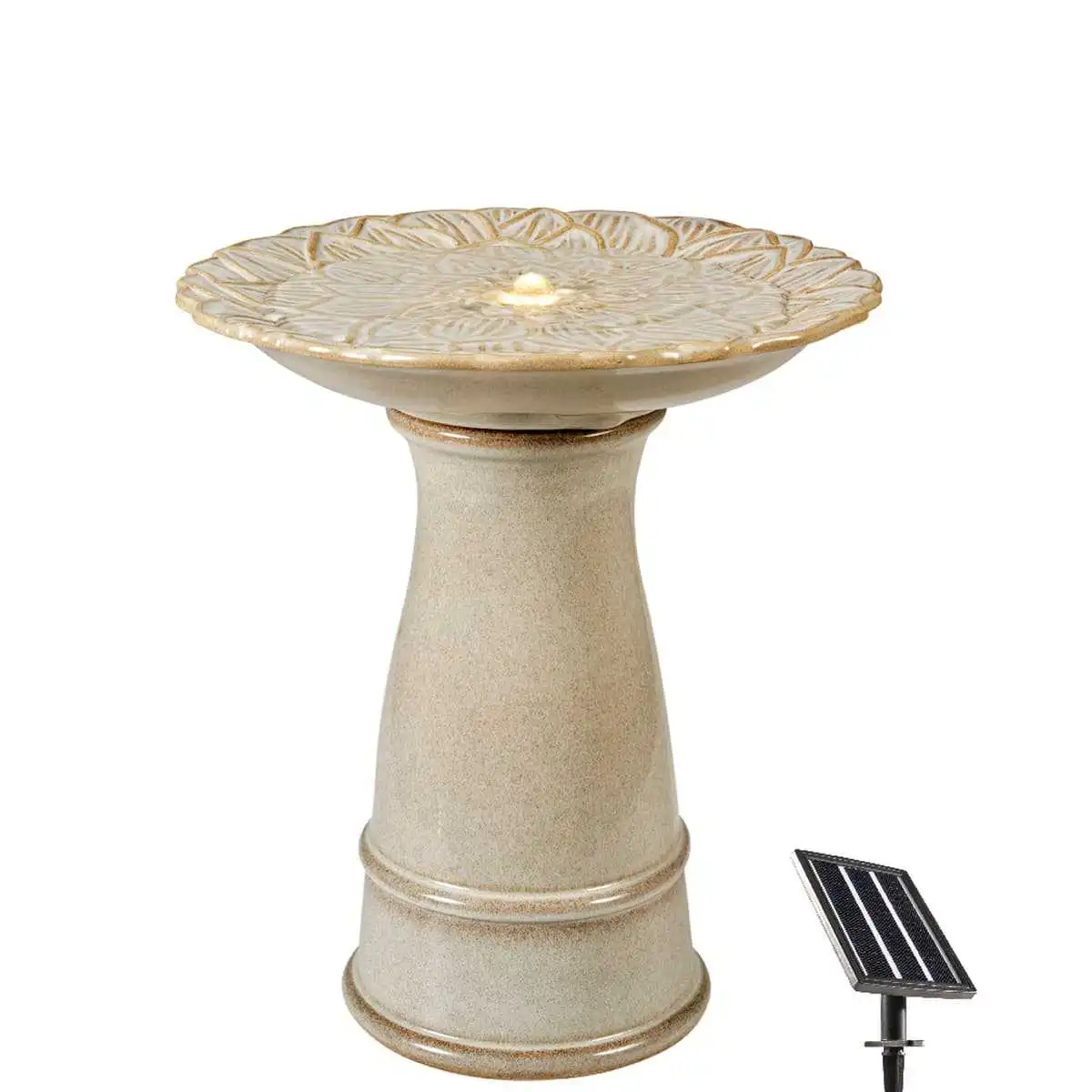Fontaine de jardin solaire sur pied en céramique avec LED - Blanc cassé - D.40 x H.44,5 cm