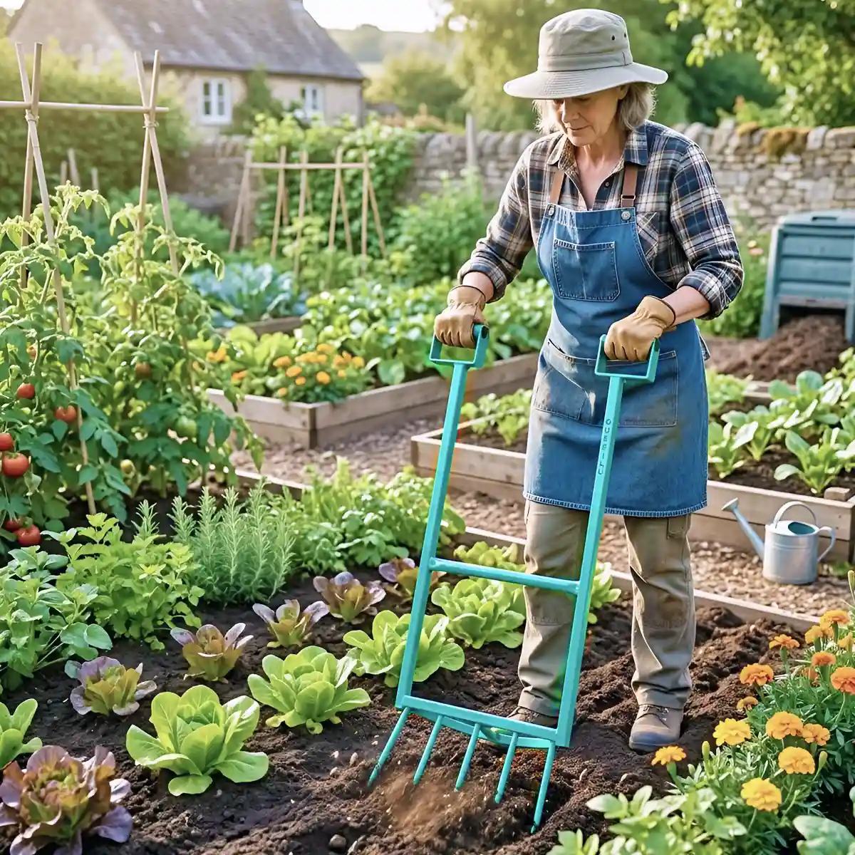 - Aère le sol en profondeur sans le retourner, afin de préserver la vie microbienne.