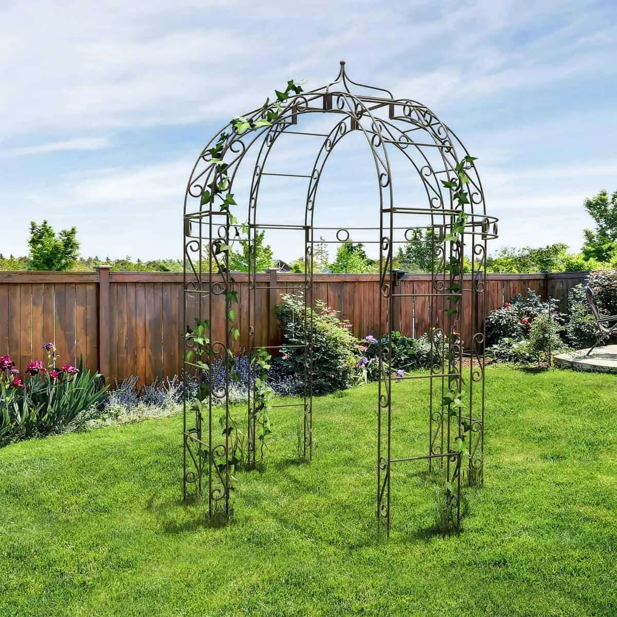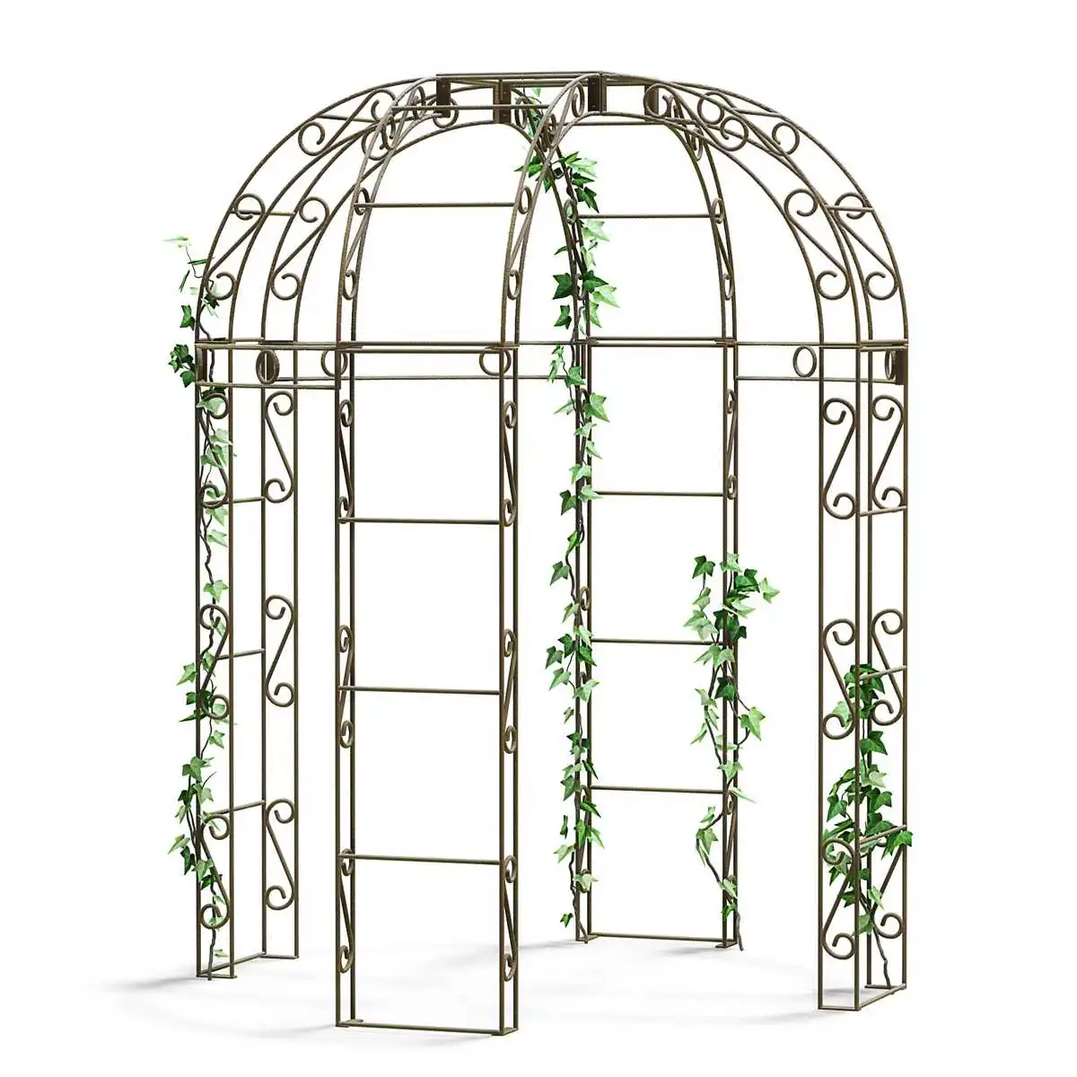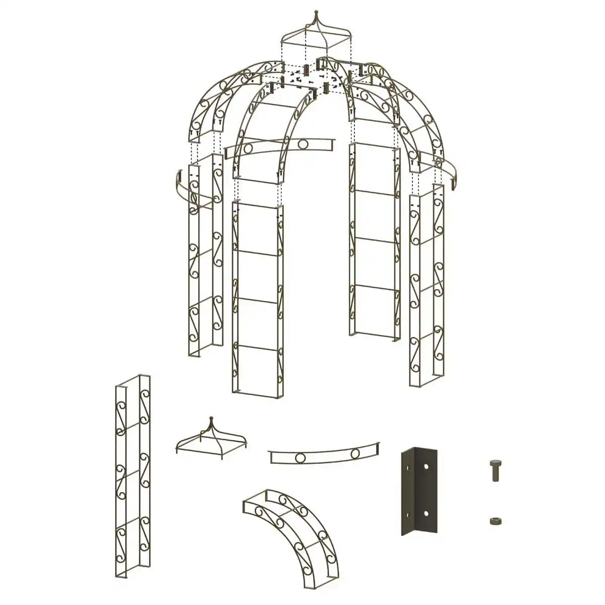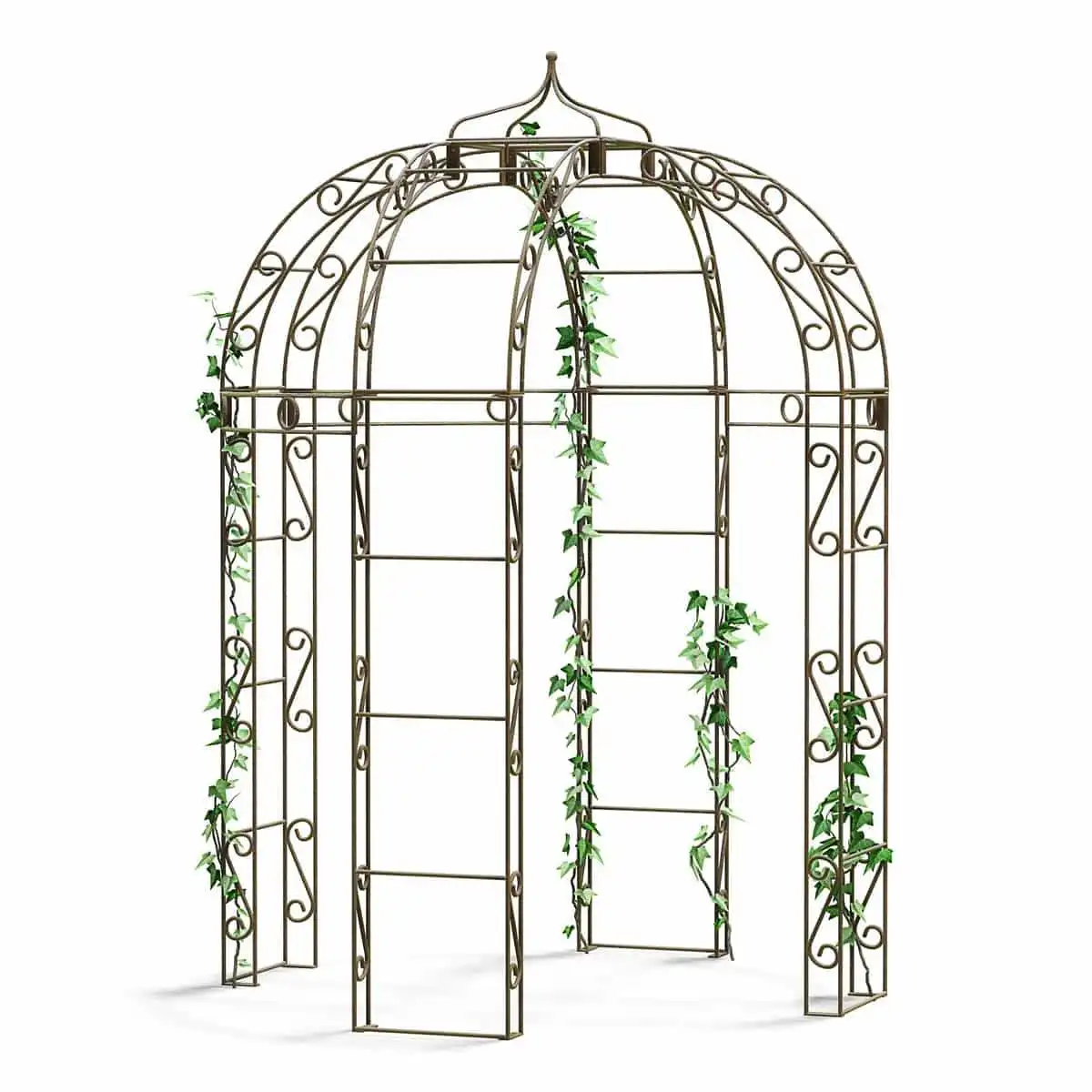 Gloriette en fer 4 pieds Arcade 2,80m2 Superbe gloriette en fer cintré. se monte sans difficulté avec une clé de 10 en assemblant le dôme, puis en y visant les 4 pieds. Légère, elle ne vrille pas et se fixe au sol avec des sardines ou peut être vissé sur un sol en ciment. Peinte avec un marron pailleté qui capte le soleil, elle est le support idéal pour un rosier ou des bignones. Les volutes rappellent celles du tunnel ou des demi arches, vendues sur ce site. cette gloriette fait 2,5 mètre de haut et environ 1,20 de large. c'est un très beau support, une pièce maitresse de votre jardin.
