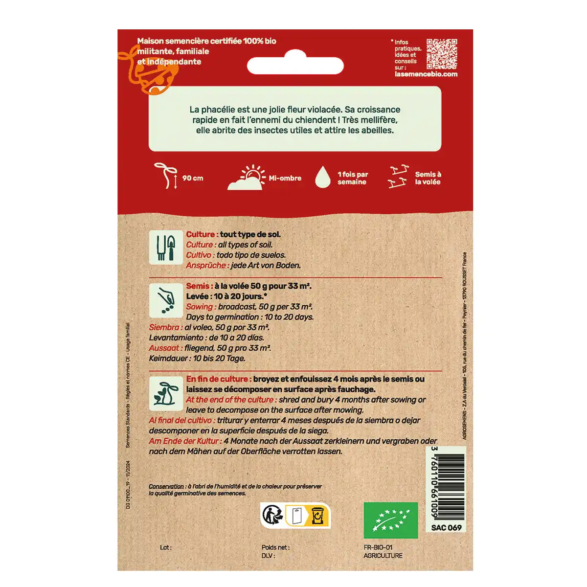 La phacélie est un excellent engrais vert, apprécié pour sa croissance rapide et sa grande capacité à améliorer les sols. Elle couvre efficacement le terrain, limitant les mauvaises herbes, et protège contre l'érosion.