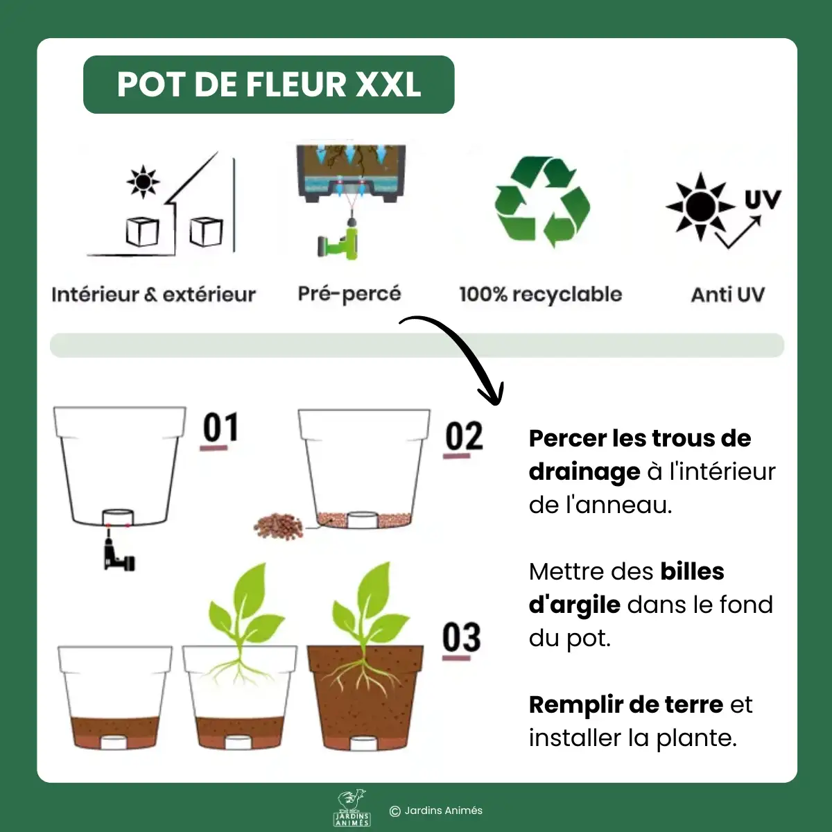 Pour une utilisation en intérieur, il n'est pas recommandé de percer le pot. Des billes d'argile au fond du bac, ainsi qu'un arrosage modéré suffira pour entretenir votre plante.