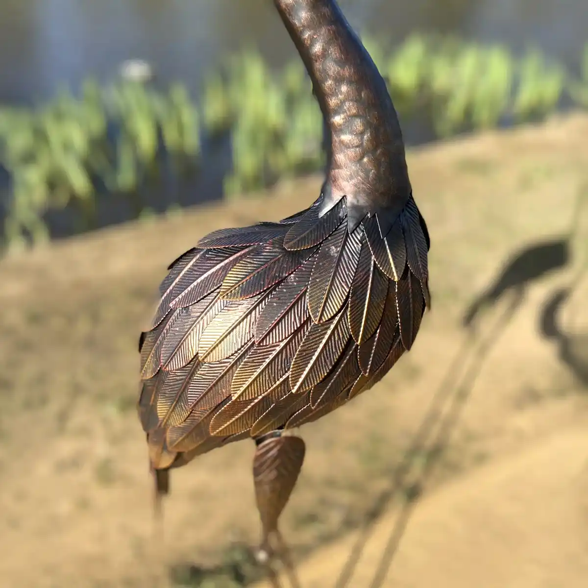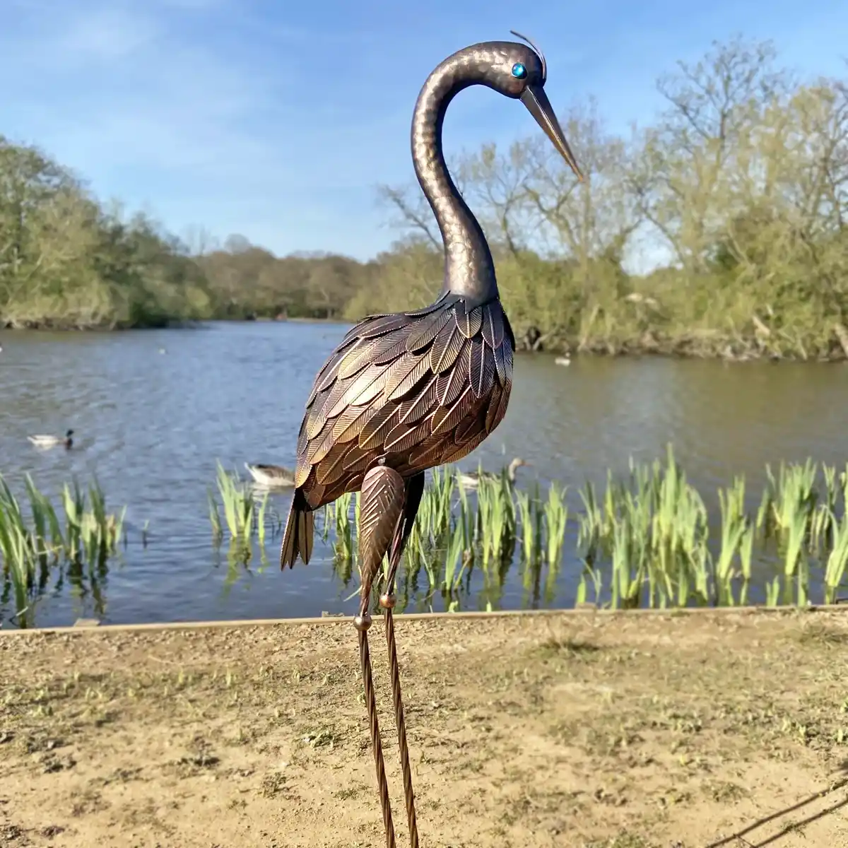 La sculpture est livrée avec un piquet pour fixer l'échassier dans le sol.
