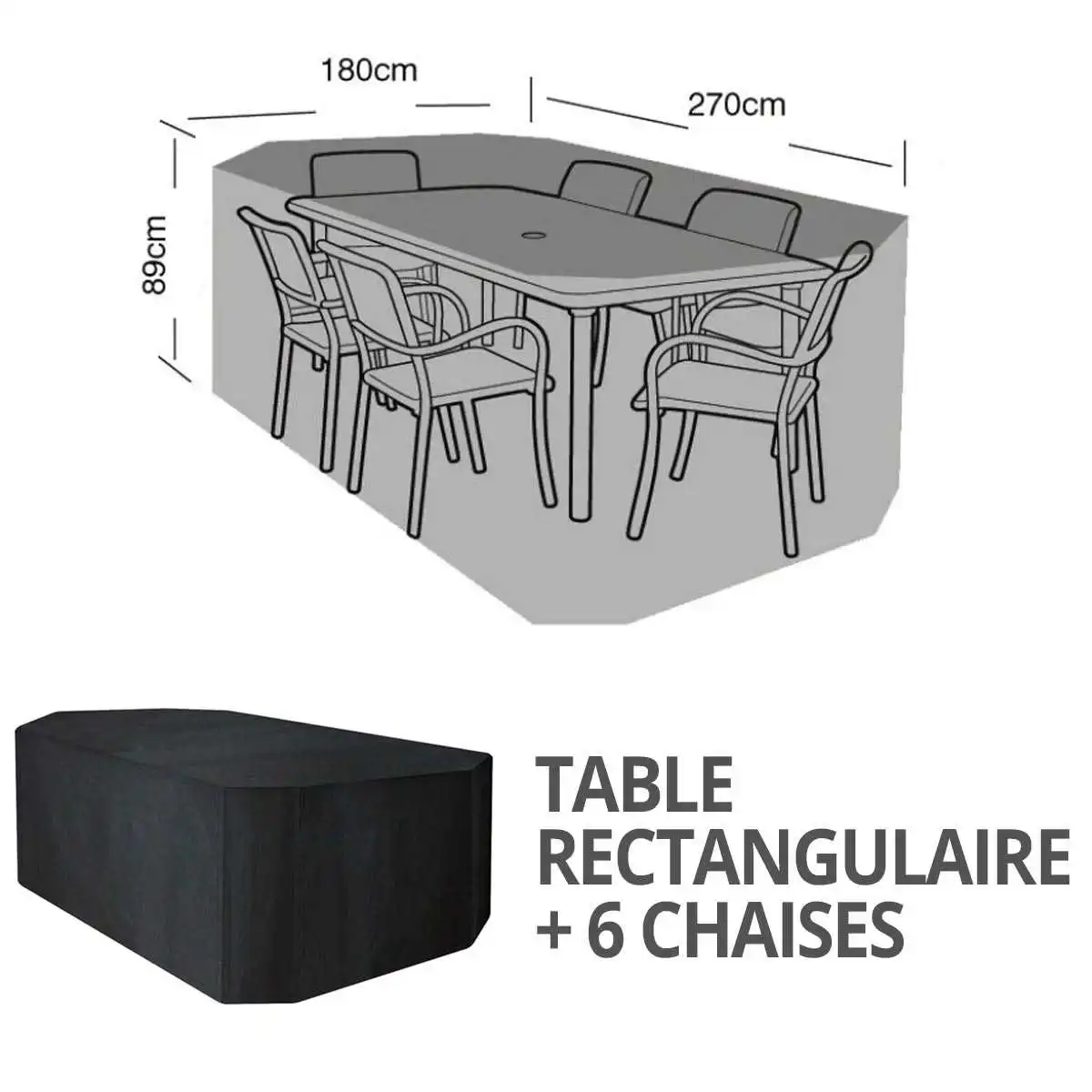 Housse bâche protection table rectangle + 6 chaises long. 270cm parfaite.... le printemps arrive, elle est comme neuve malgré les intempéries de l'hiver; la table en dessous est bien seche. Rien à redire