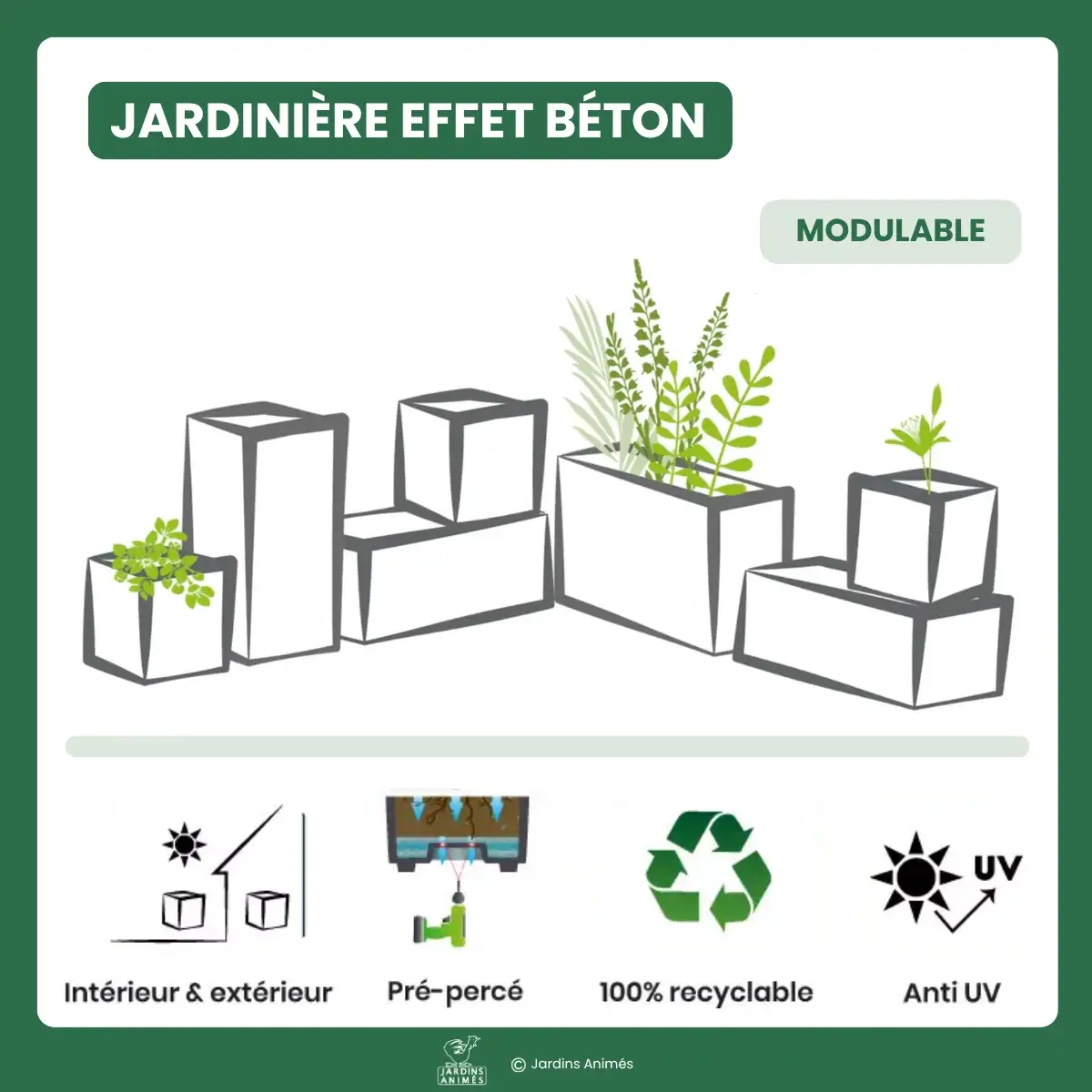 - Format jardinière rectangle ou carré, empilable et modulable pour créer des ensembles aux hauteurs variées