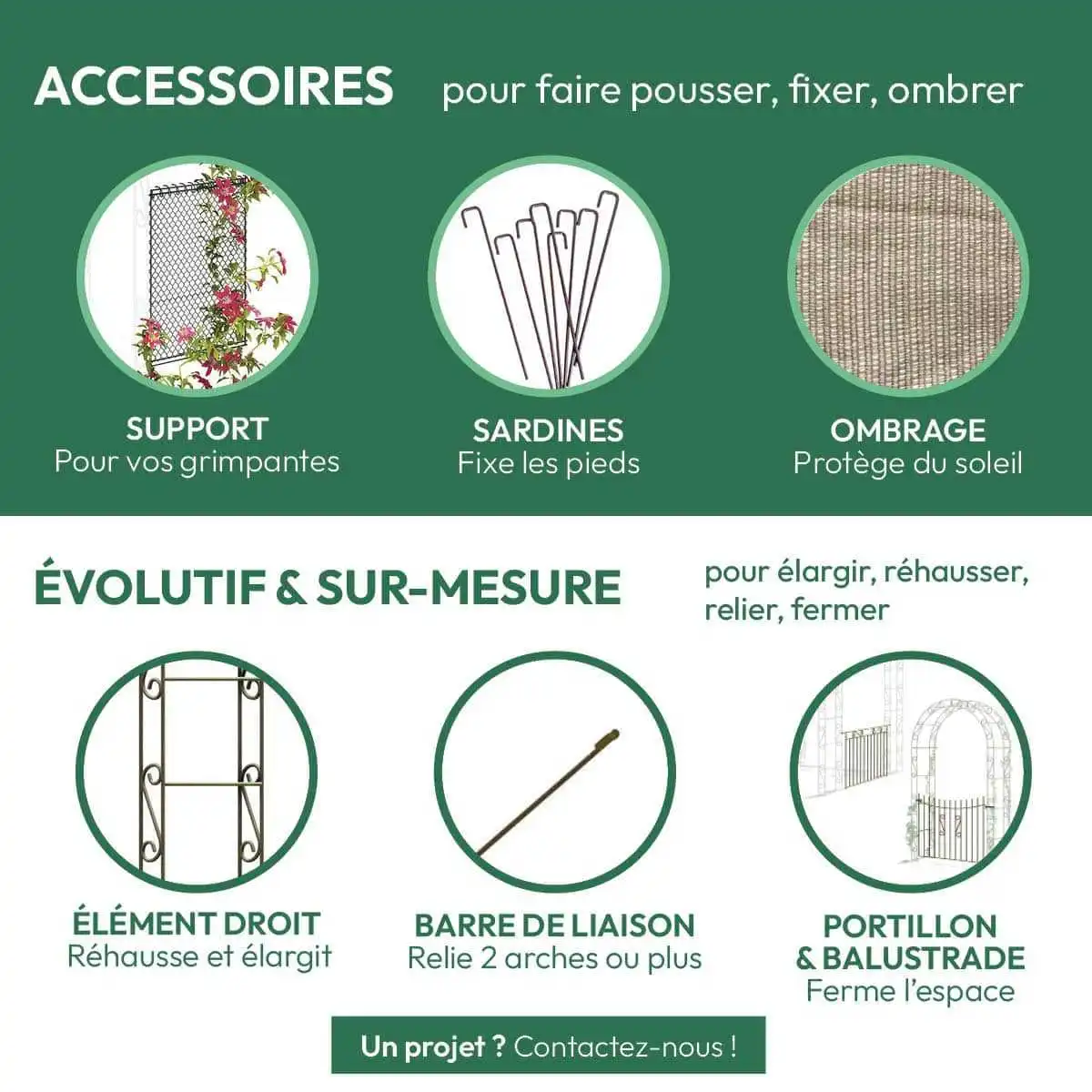 Cette tonnelle en acier plein de section 8mm est robuste. Elle soutient tout type de plantes grimpantes, du rosier à la glycine.