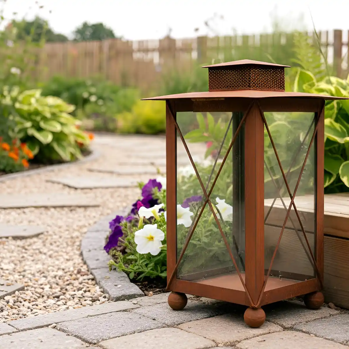 Cette lanterne décorative en métal rouillé s'intègre parfaitement à tout type d'extérieur. Placée au centre d'une table, sur une marche d'escalier ou au bord d'une fenêtre, elle diffuse une douce ambiance lumineuse dès la tombée de la nuit.