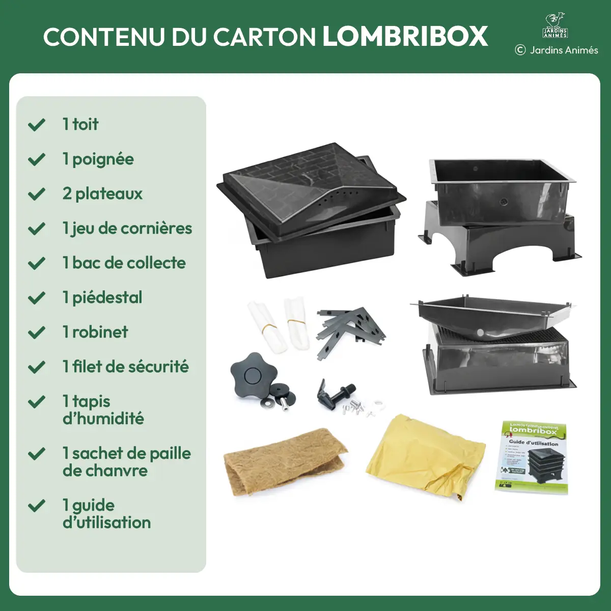- Lombribox® livré avec 2 plateaux, un toit étanche, deux petits sachets de terre, un filet de sécurité, un guide explicatif, les accessoires de montage et un robinet.