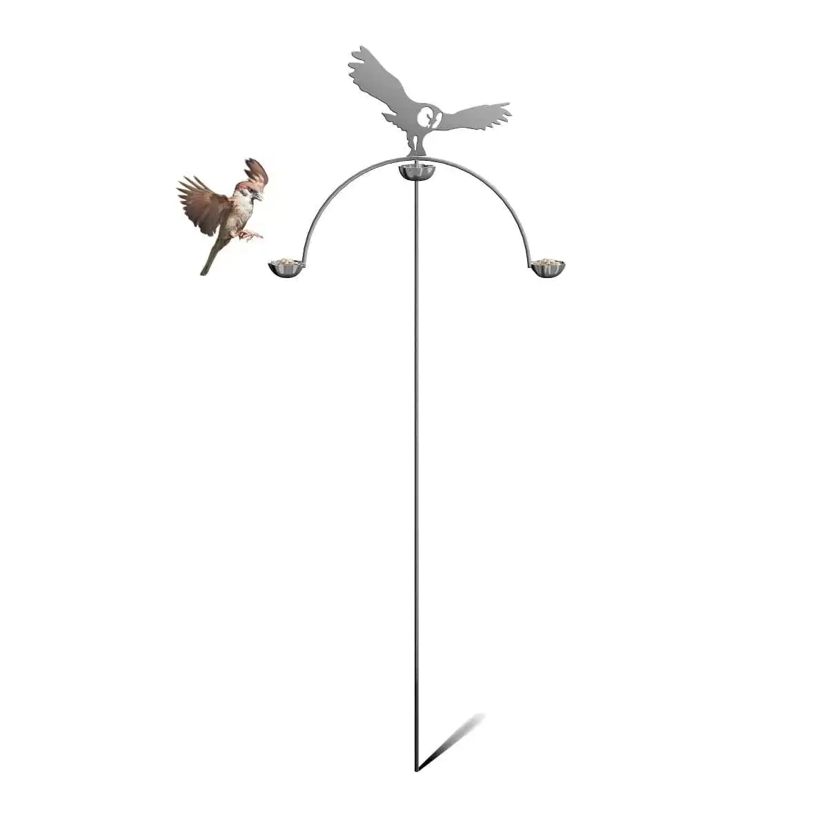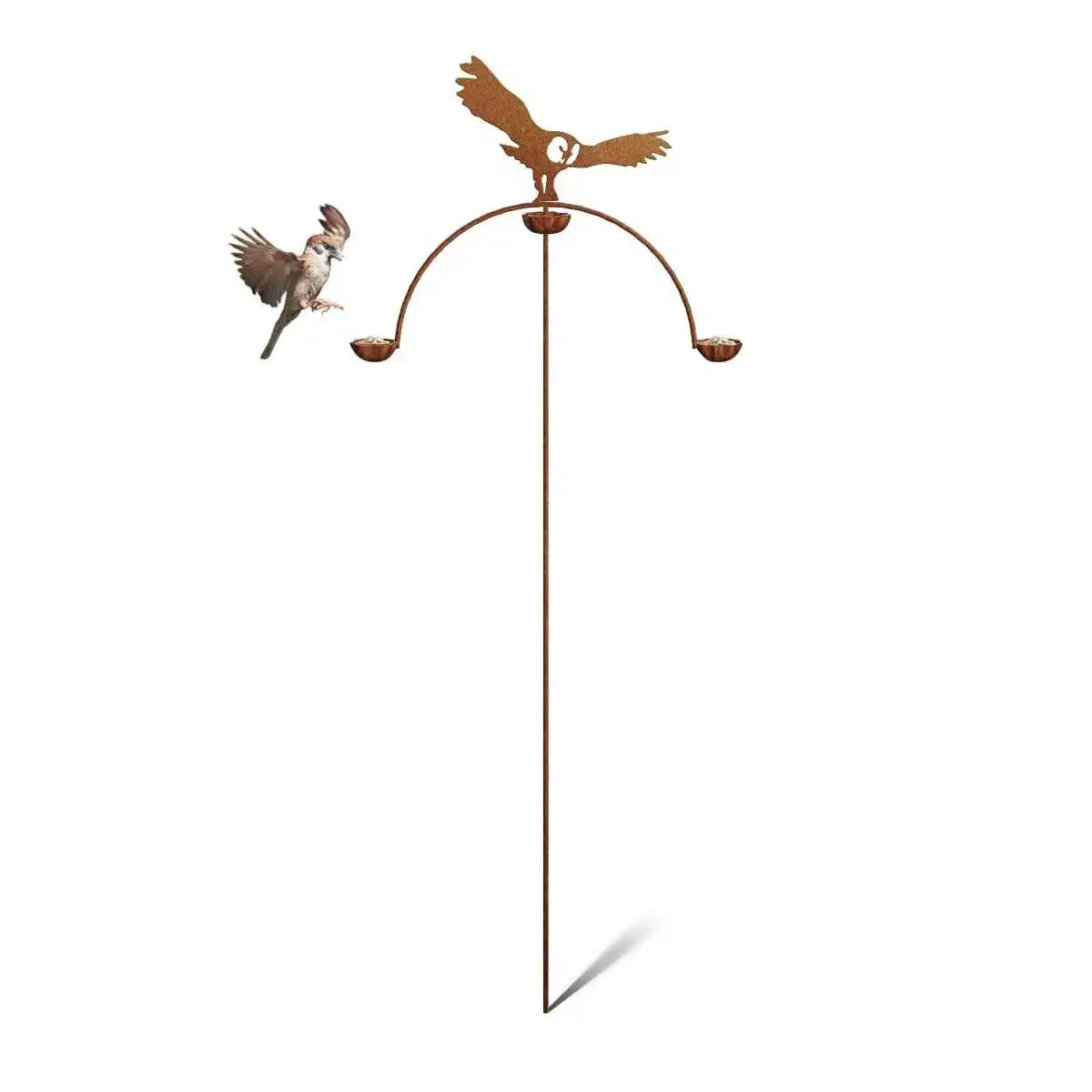 - Mangeoire balancier sur pied en acier corten - Chouette en vol