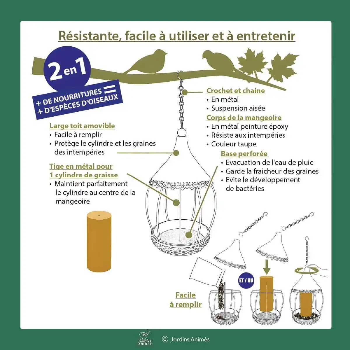 Conçue pour accueillir un cylindre de graisse végétale (850 g) et/ou des graines, elle offre un espace gourmand et sécurisé à vos visiteurs ailés. Il suffit d’enfiler le cylindre sur l’axe central et de verser quelques graines dans le panier inférieur pour que mésanges, sittelles ou pics viennent se régaler à l’abri.