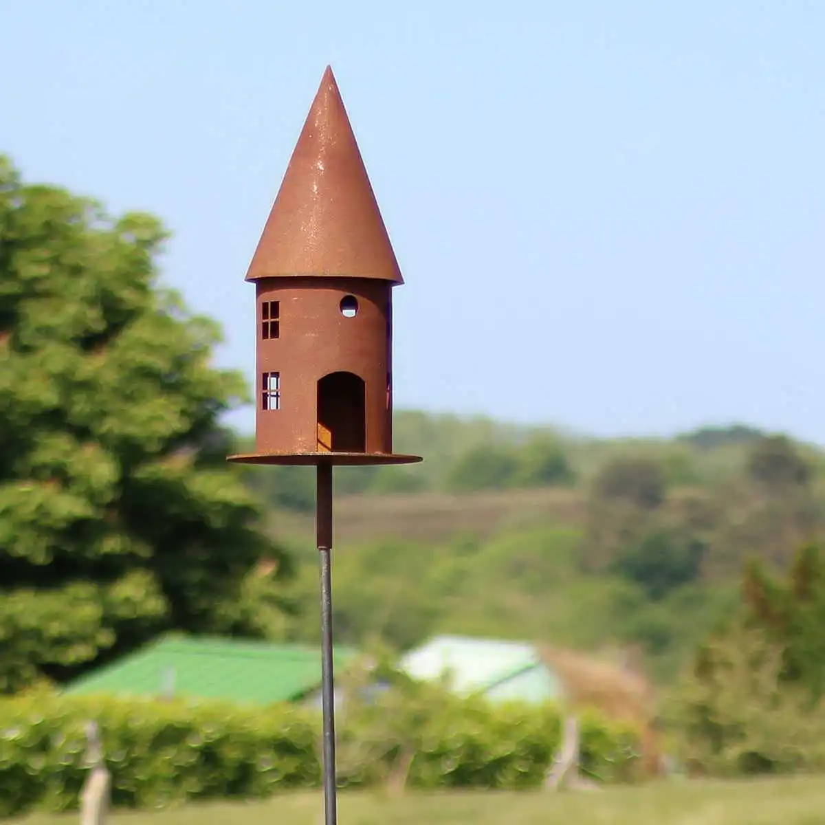 Mangeoire maison ronde en métal rouillé