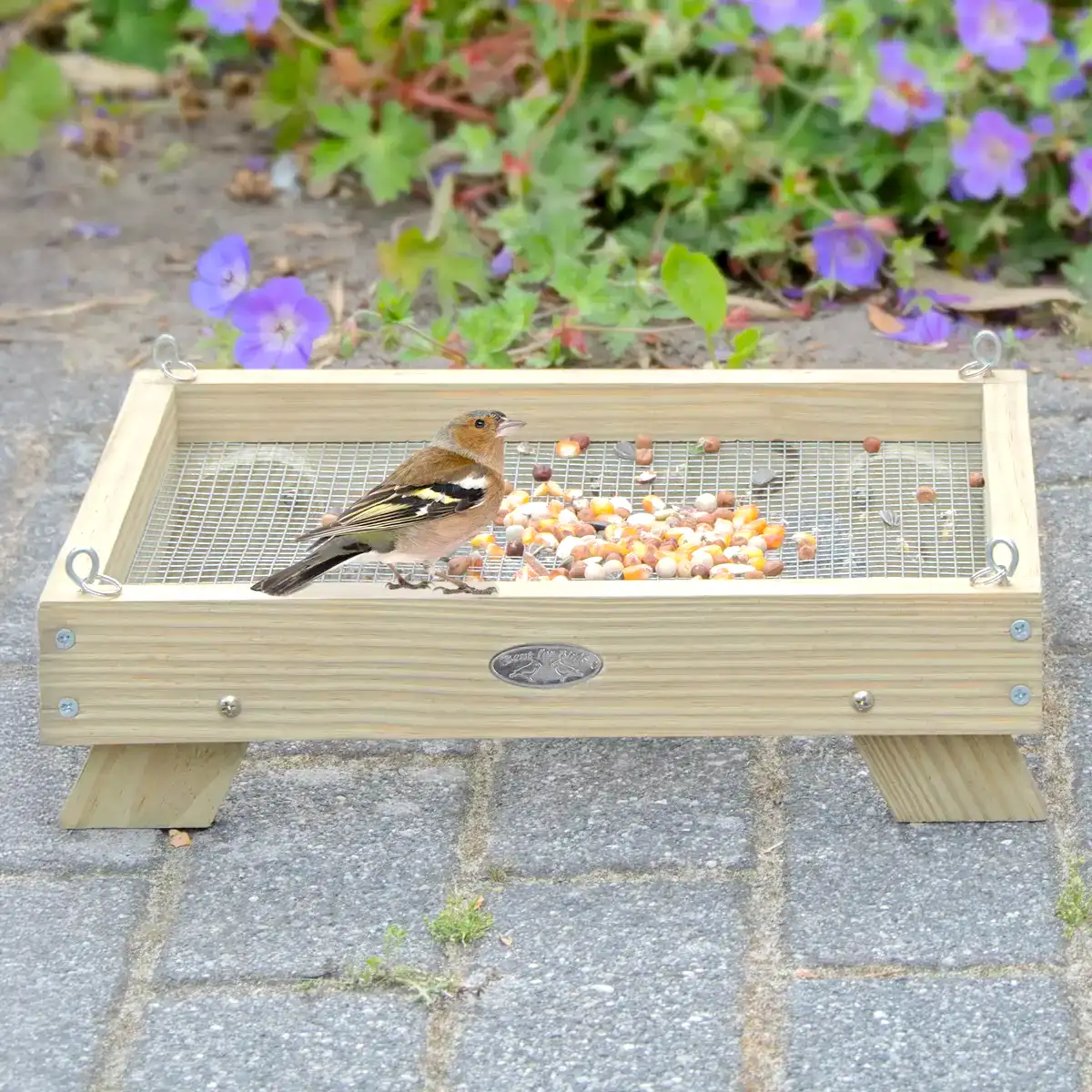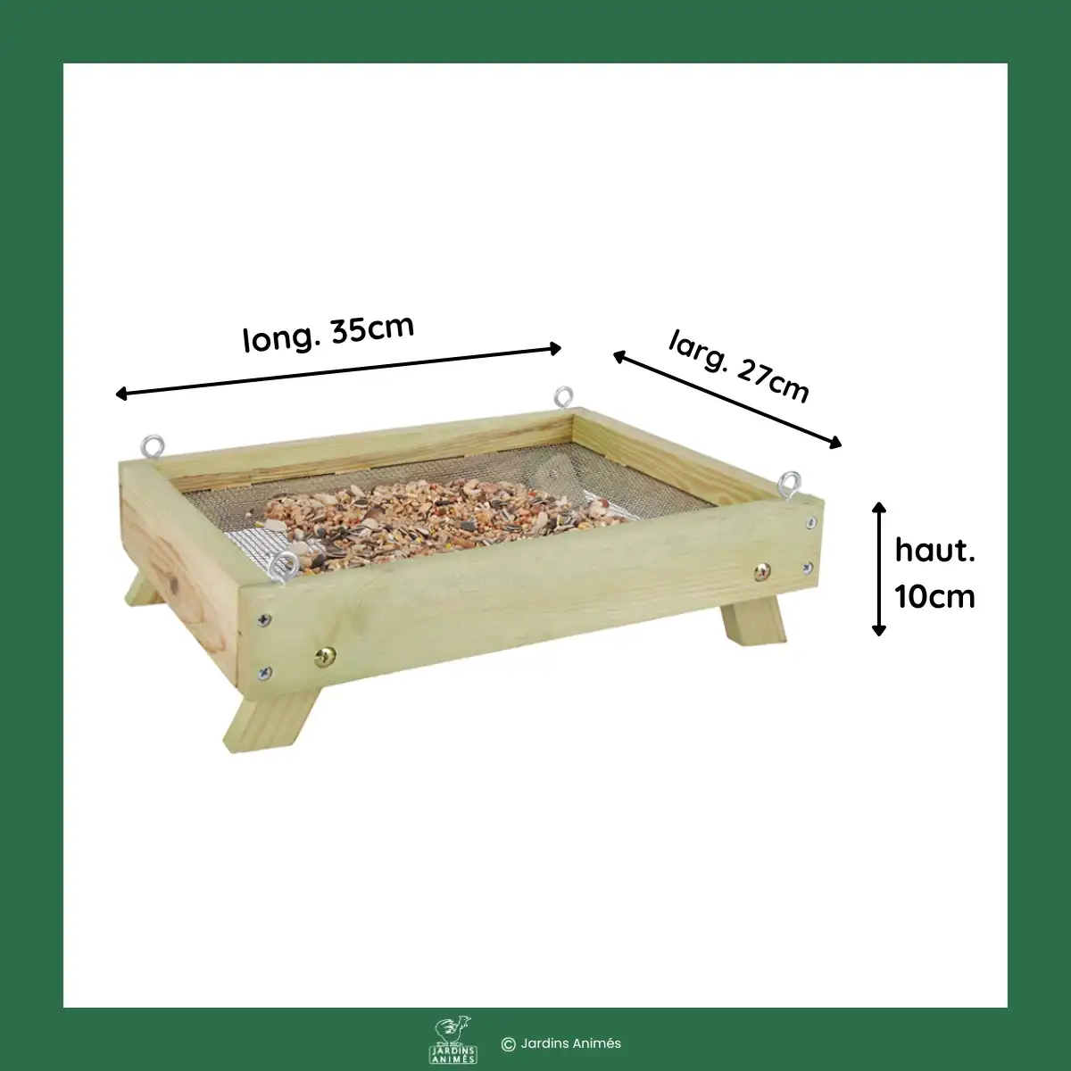 je connais ce produit chez une amie. Cette mangeoire est très bien conçue, pas trop surélevée pour nos petits oiseaux ou ( pour les chanceux), hérissons. Le fin tamis évite le pourrissement des graines, le bois lui donne une allure rustique qui s'intégre parfaitement au jardin. Et le plus : prix plus que raisonnable !