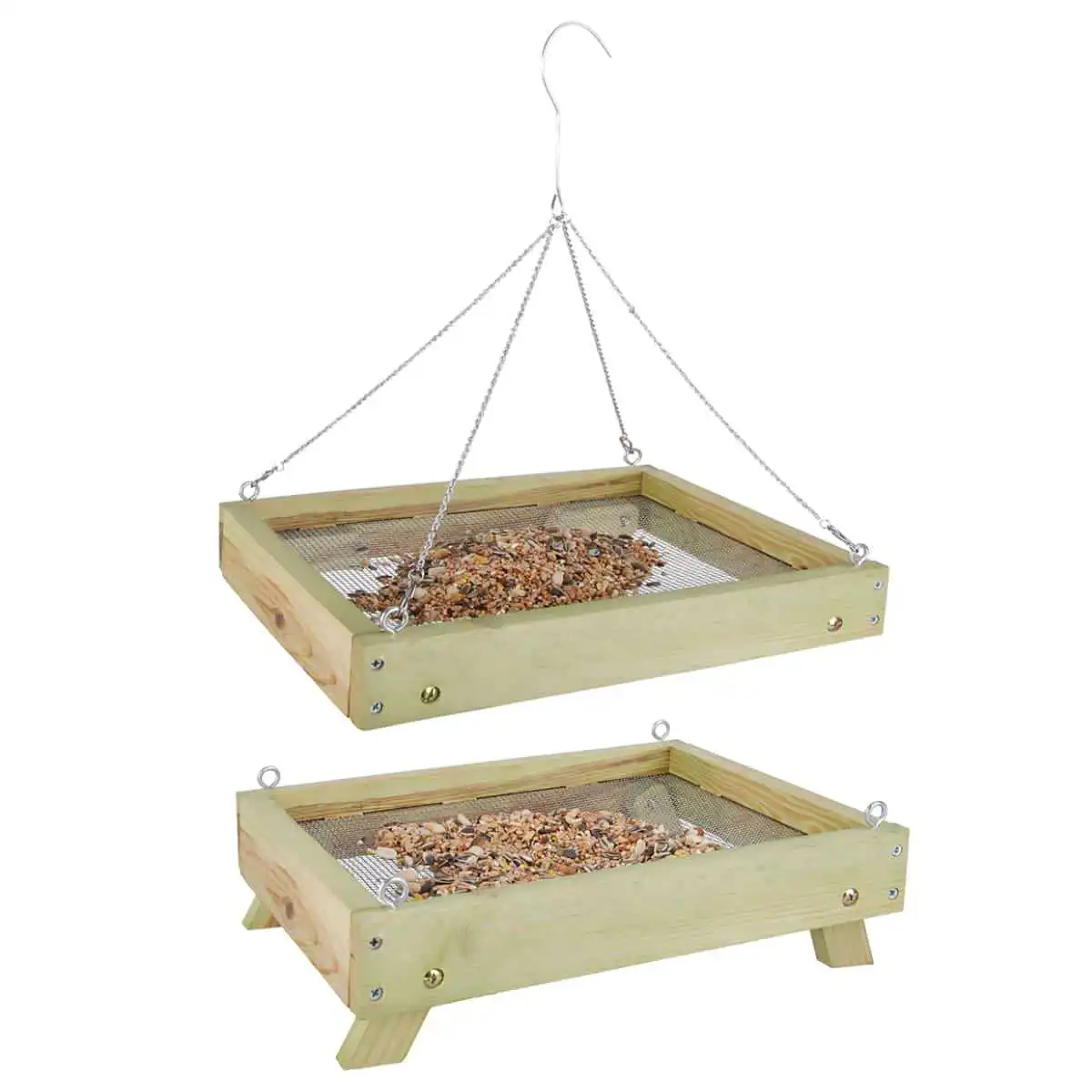 En dépliant les pieds, la table à oiseaux peut être placée sur la pelouse et facilement déplacée. - Suspendue : la mangeoire peut attirer d'autres oiseaux plus acrobates tels que la mésange charbonnière, la mésange bleue et la mésange à longue queue.