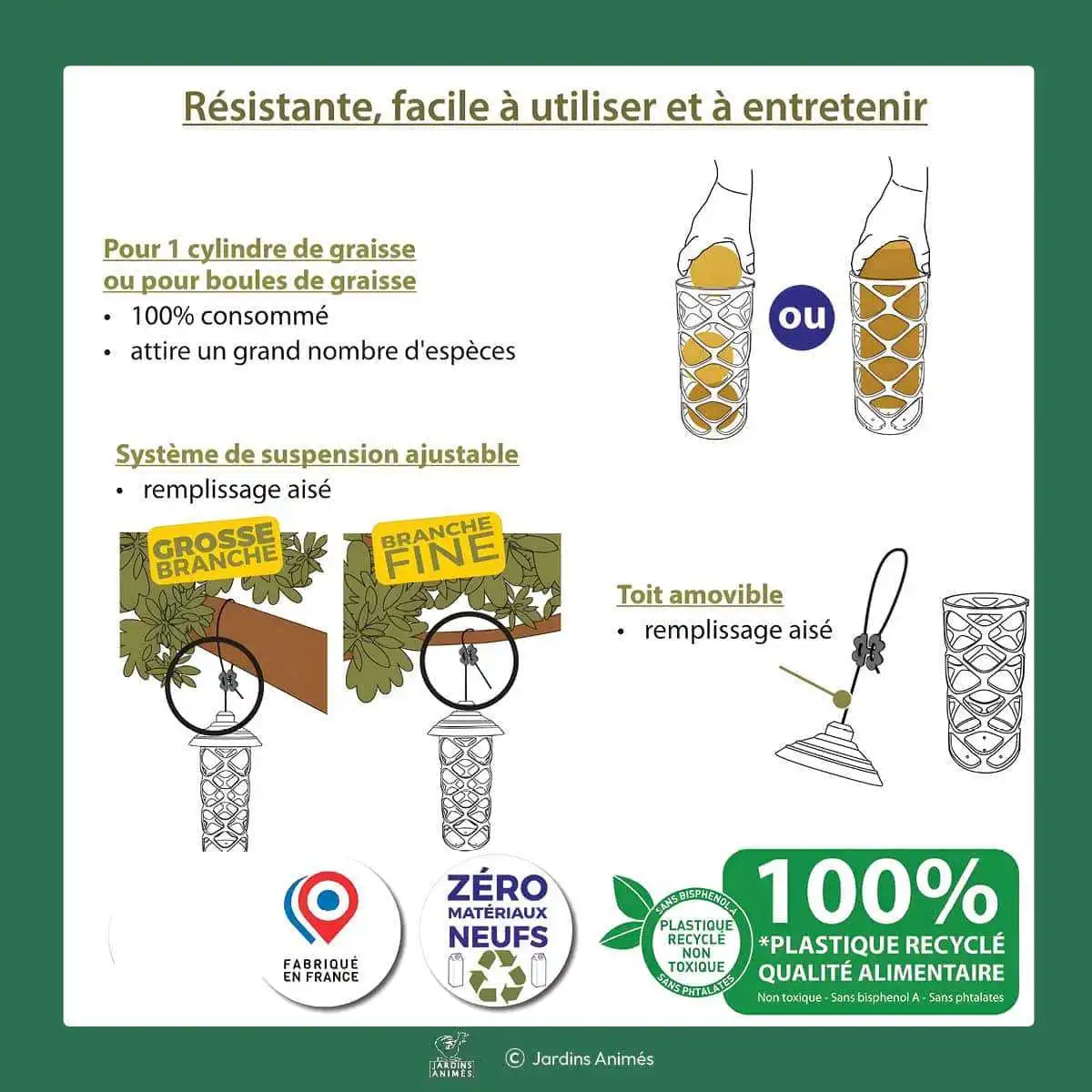 Conçue pour accueillir aussi bien des boules de graisse que des cylindres de 850 g, elle favorise une consommation complète de la nourriture sans gaspillage. Une solution durable, pratique et pleine de charme pour offrir une pause gourmande à mésanges, moineaux, rouges-gorges et autres visiteurs ailés.