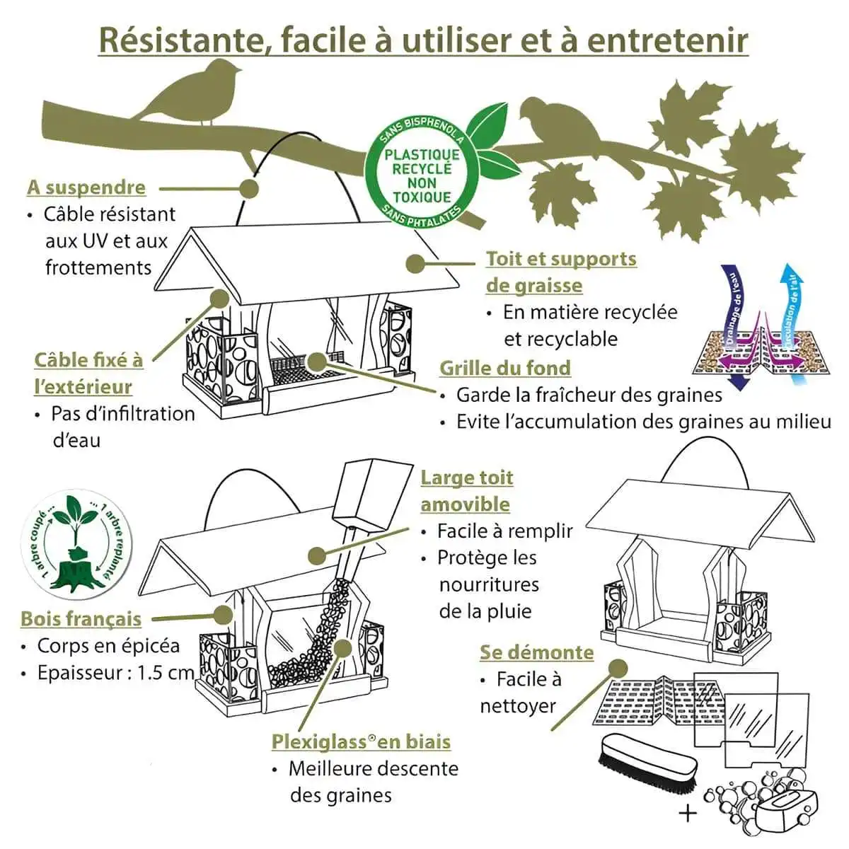 - Corps de la mangeoire : épicéa français certifié PEFC