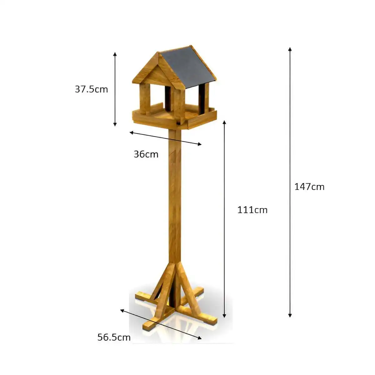 La partie "table" sur laquelle disposer les graines et arachides mesure 36 x 36cm. Elle se trouve à 105cm du sol et dispose de 2 crochets pour suspendre des boules de graisse.