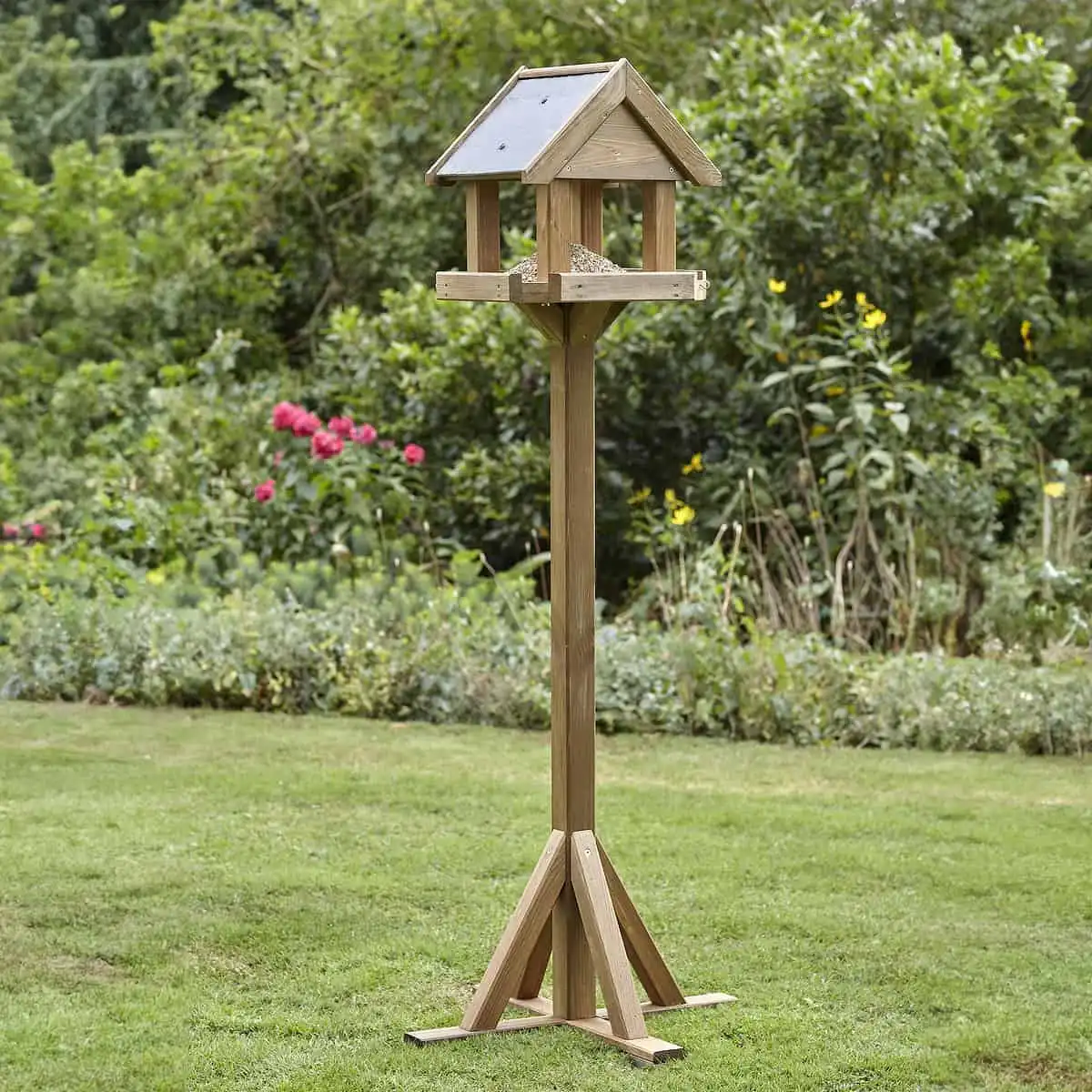 Mangeoire oiseaux sur pied en bois - Toit double pente effet ardoise