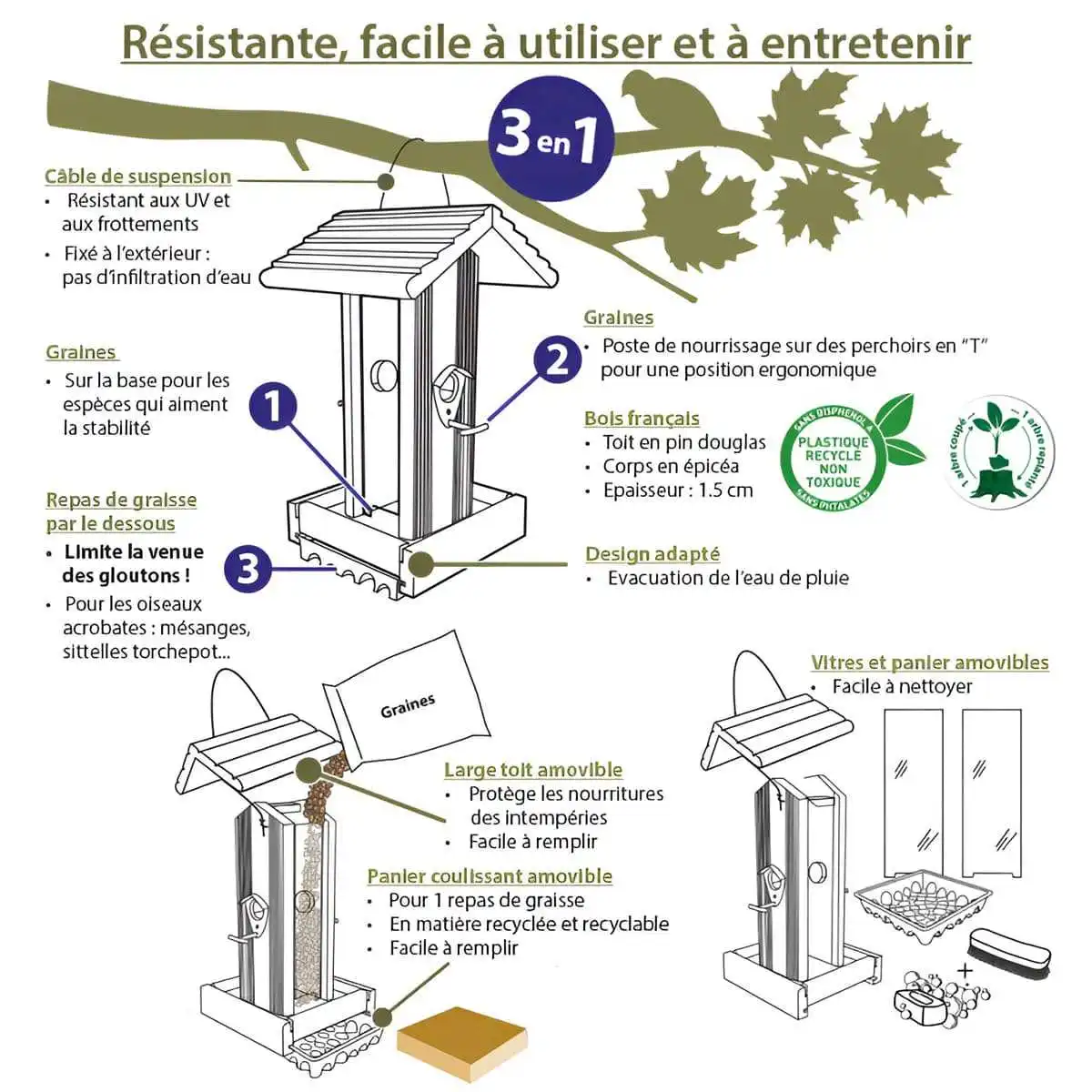 - Corps de la mangeoire : Épicéa français certifié PEFC