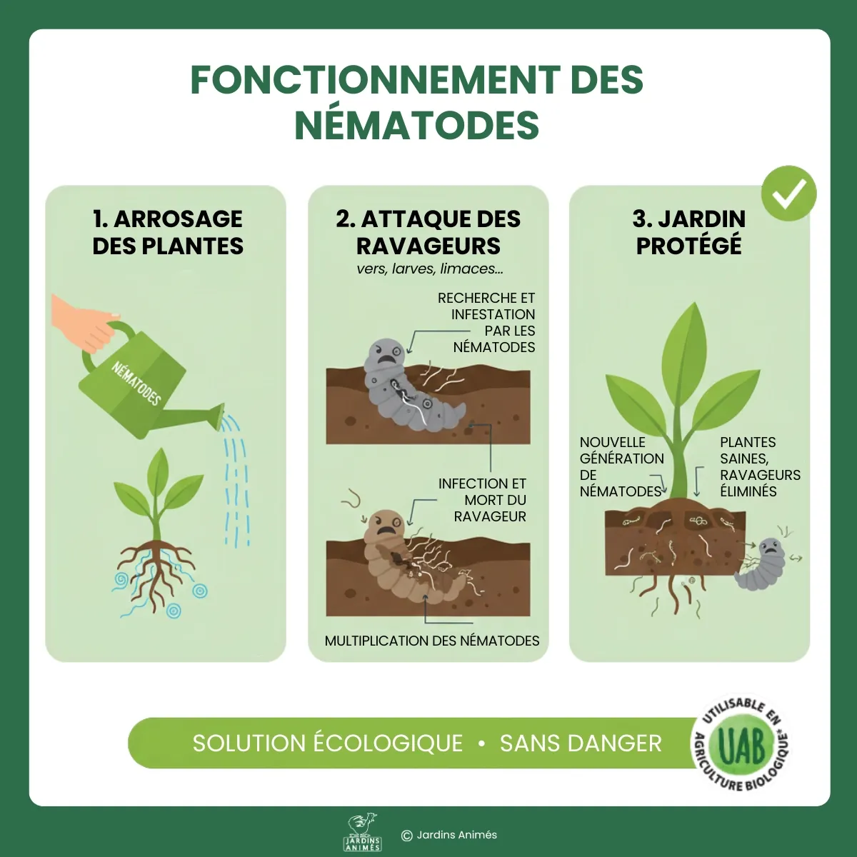 - Les nématodes sont sensibles aux produits chimiques. Il est fortement déconseillé d'utiliser un engrais ou autre traitement pendant la durée d'efficacité des nématodes, au risque de les faire mourir.